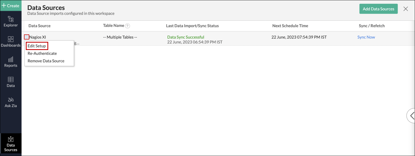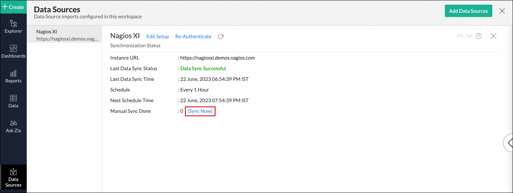 はい。これを行うには、サイドパネルから [データソース] オプションをクリックしてこのページにアクセスします。表示されるページで、Nagios XIソースに移動し、対応する[今すぐ同期]ボタンをクリックします。