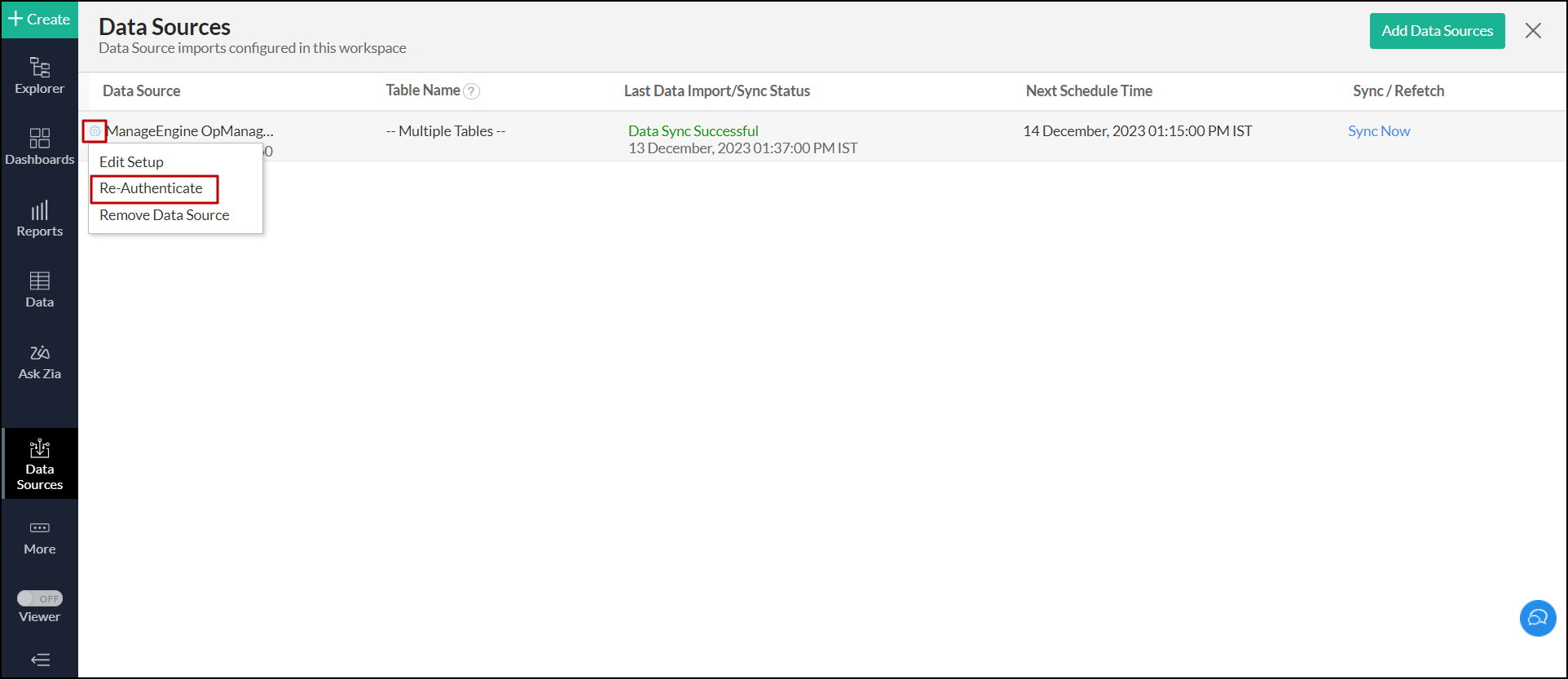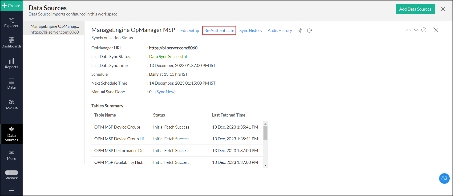 - OpManager MSPデータソースに移動し、[再認証]リンクをクリックします。