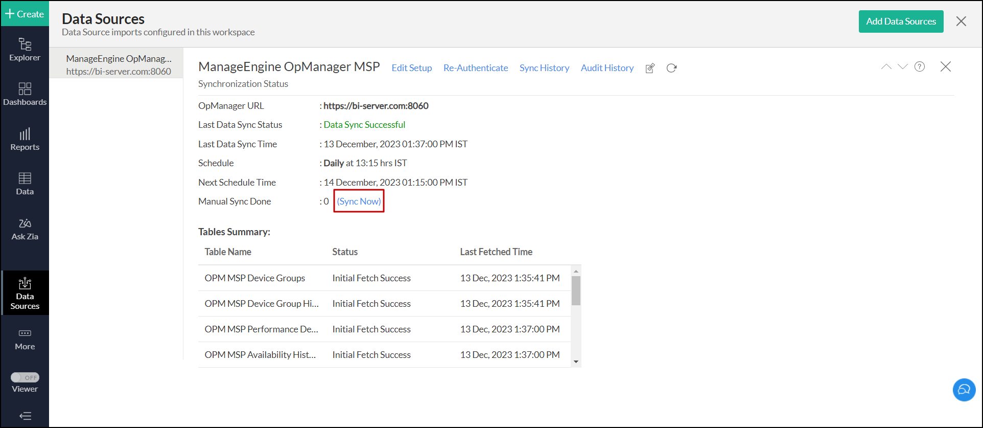はい。これを行うには、サイドパネルから [データソース] オプションをクリックしてこのページにアクセスします。表示されるページで、OpManager MSPソースに移動し、対応する[今すぐ同期]ボタンをクリックします。