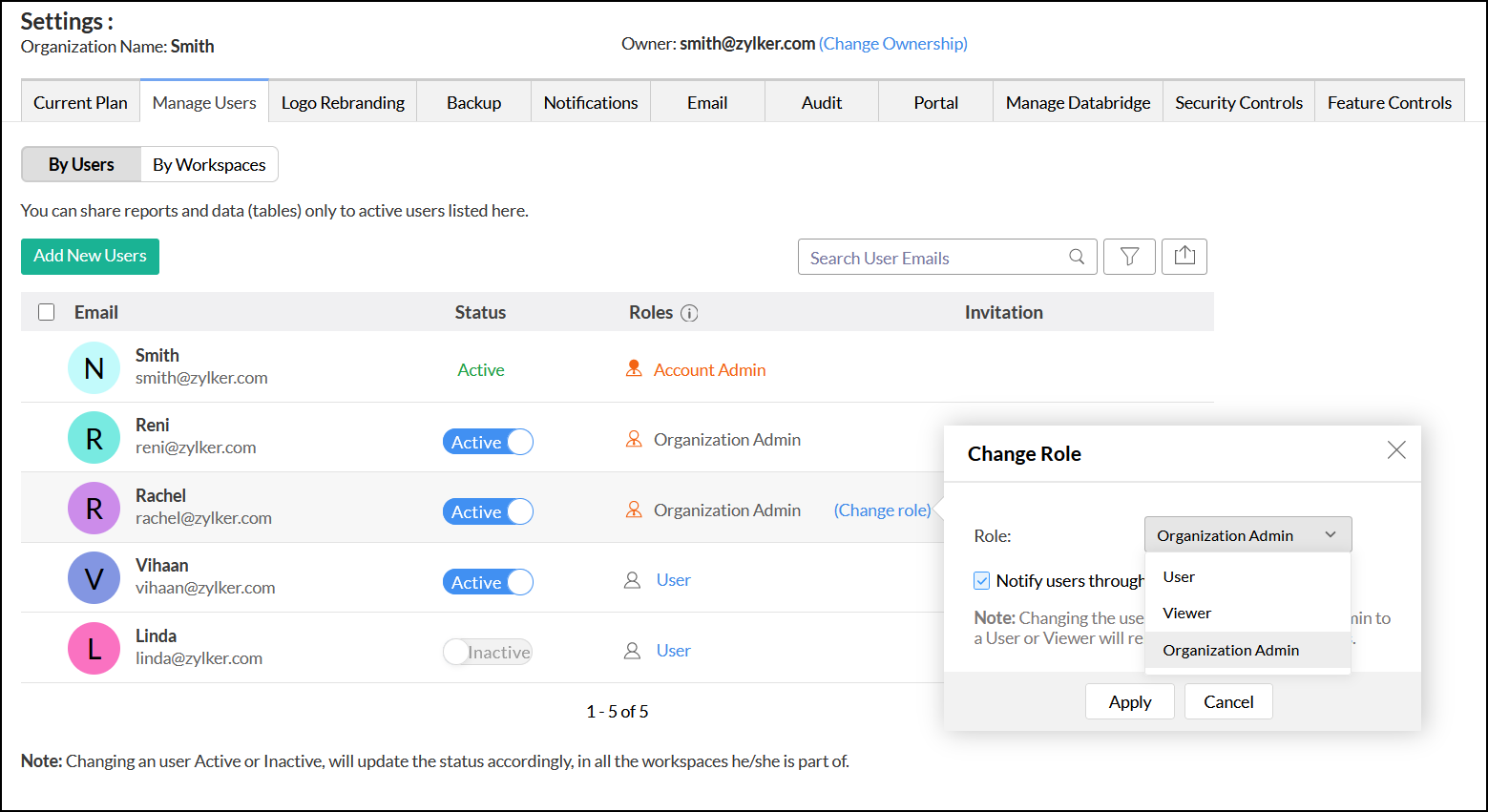 組織管理者は、組織のすべてのワークスペースへのアクセス権があり、別の組織管理者の追加、アクティブ化、非アクティブ化を除き、組織内のすべての操作を実行できます。