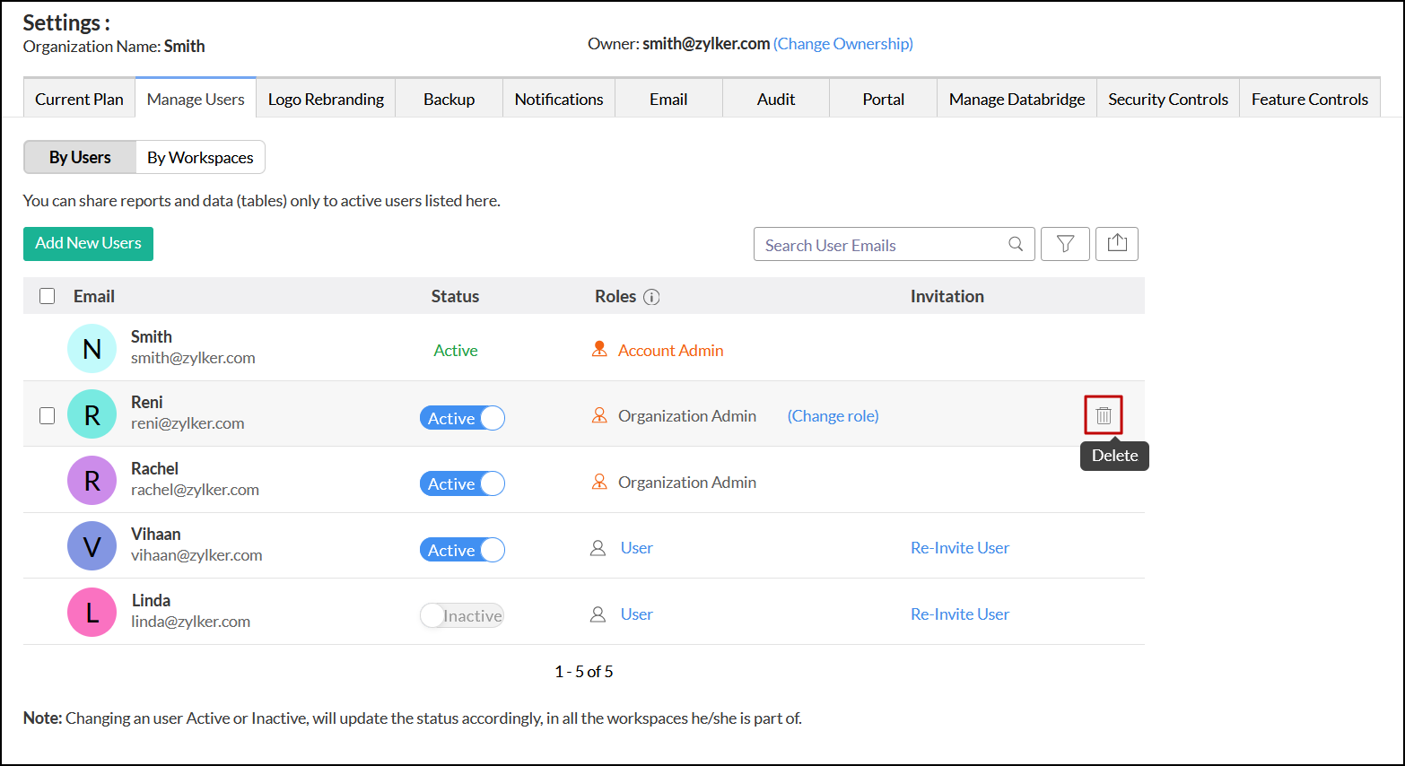 使用中のアカウントから組織管理者を削除するには、組織設定ページの[一般]→[ユーザー管理]→[ユーザーごと]タブに移動し、対象の組織管理者名にマウスオーバーして表示される[削除]アイコンをクリックします。