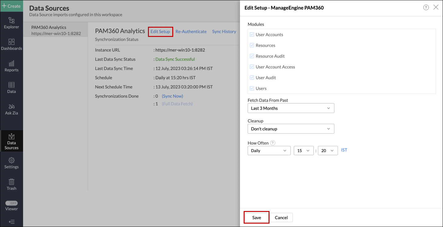 PAM360データソースに移動し、[セットアップを編集]リンクをクリックします。