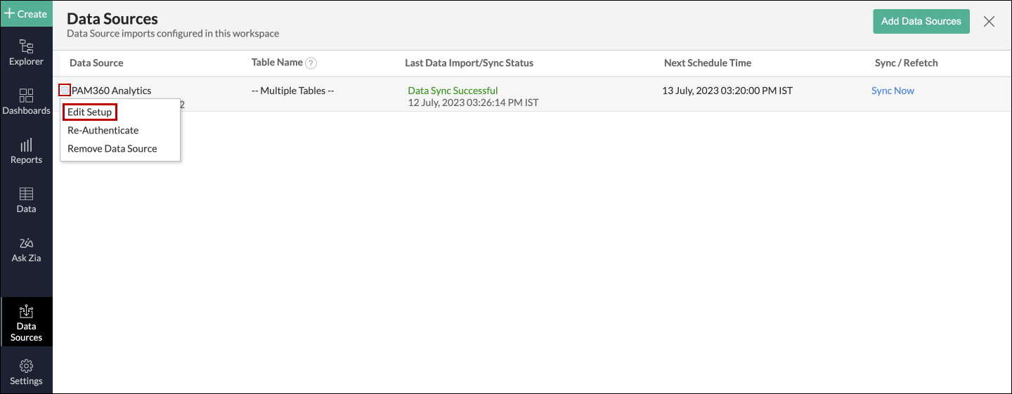 PAM360データソースの名前の上にマウスを置いたときに表示される[設定]アイコンをクリックし、[セットアップを編集] を選択します。