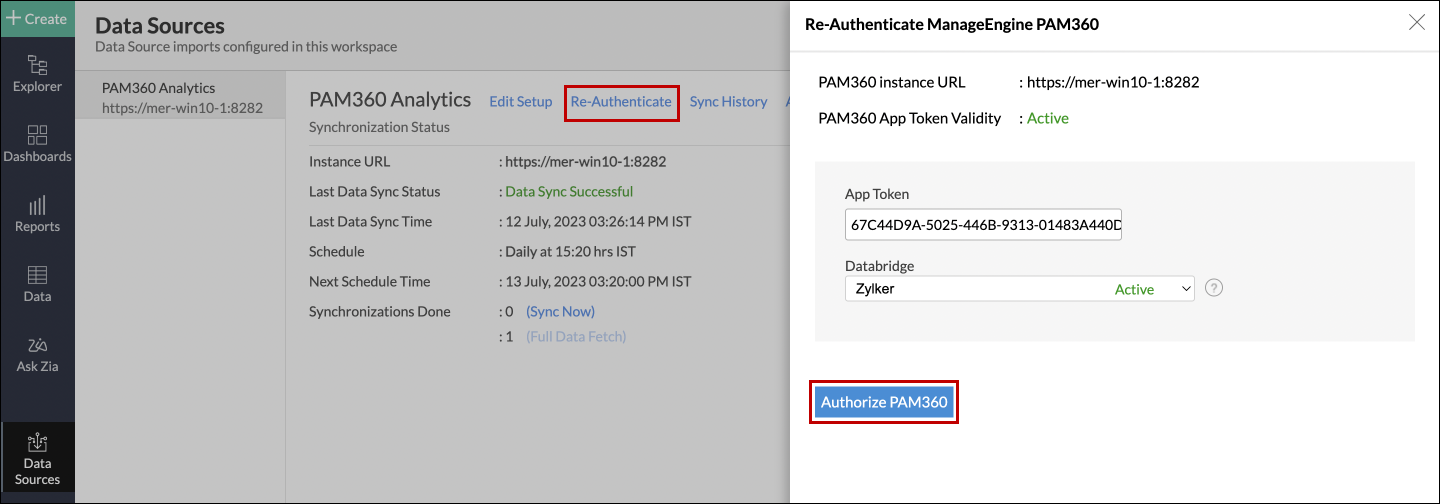PAM360データソースに移動し、[再認証]リンクをクリックします。