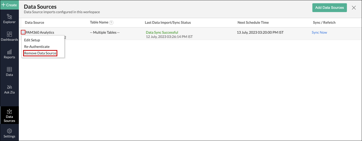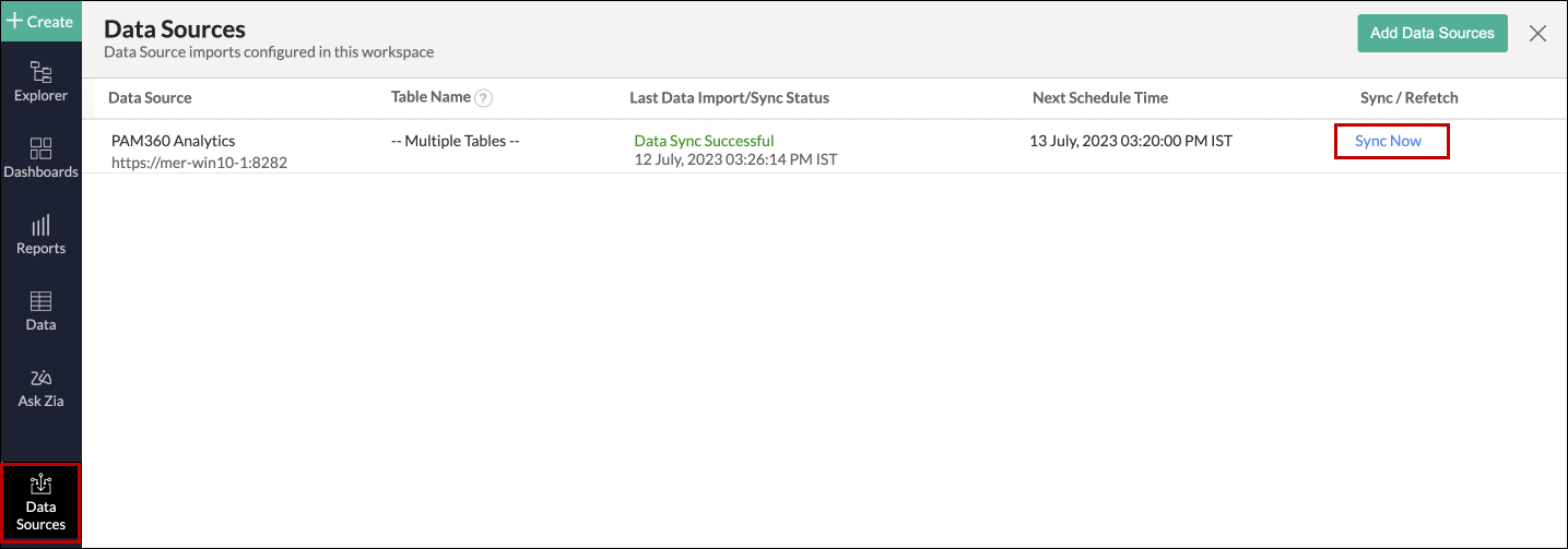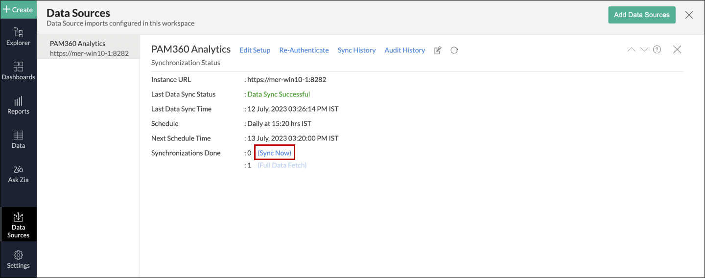 はい。これを行うには、サイドパネルから [データソース] オプションをクリックしてこのページにアクセスします。表示されるページで、PAM360ソースに移動し、対応する[今すぐ同期]ボタンをクリックします。