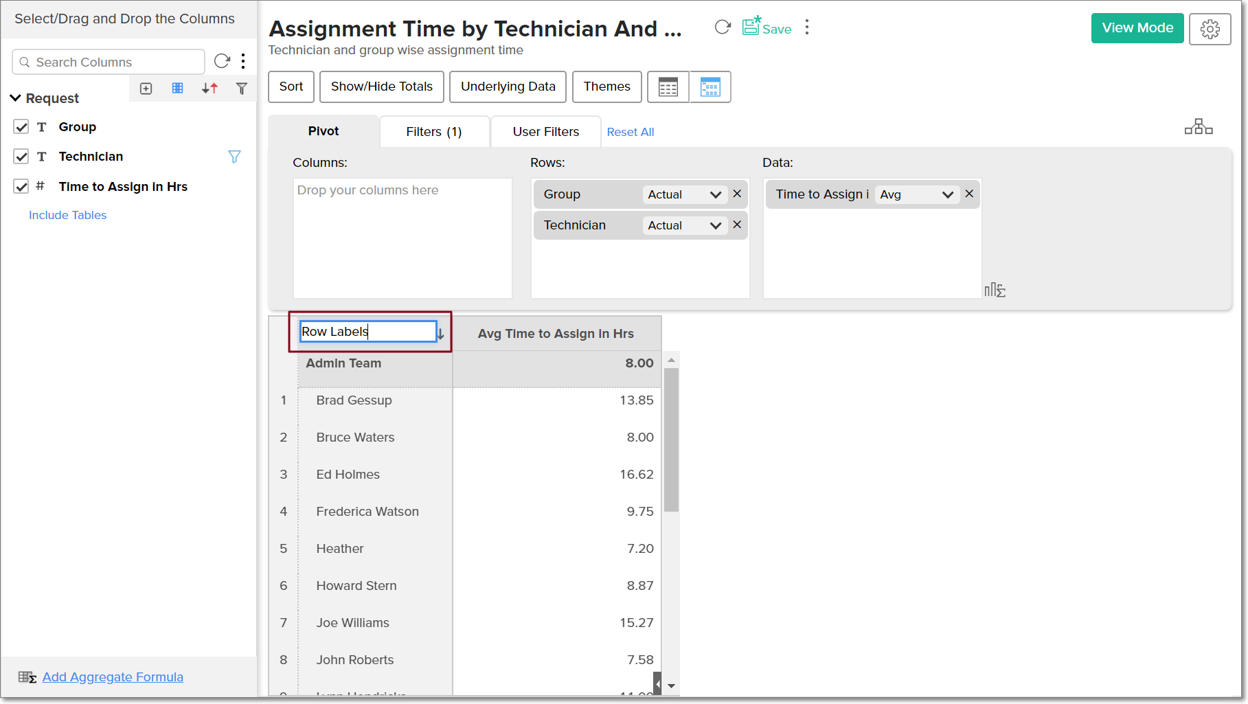 ピボット テーブルを作成すると、ManageEngine Analytics Plus は、選択した集計関数に基づいて、集計列と集計コラムを自動的に追加します。ピボット テーブルの列シェルフに複数のコラムを追加した場合は、各データ グループの概要値を表示する列も追加されます。データ シェルフにドロップされたコラムごとに、ピボット テーブルの右側に集計コラムが追加されます。