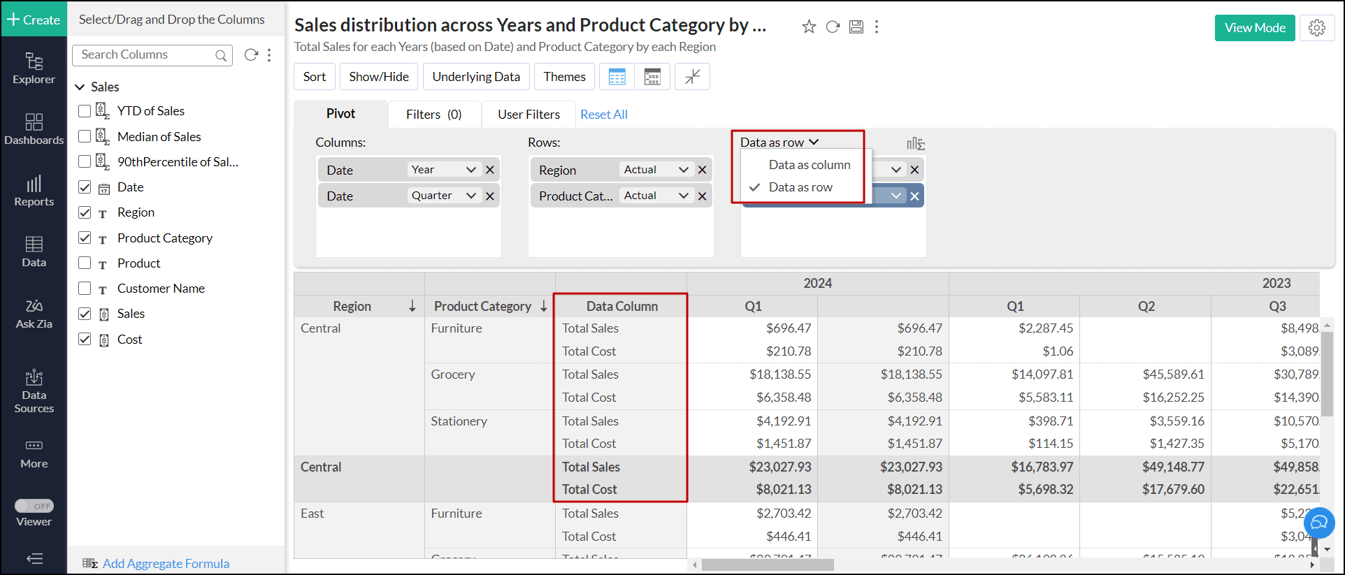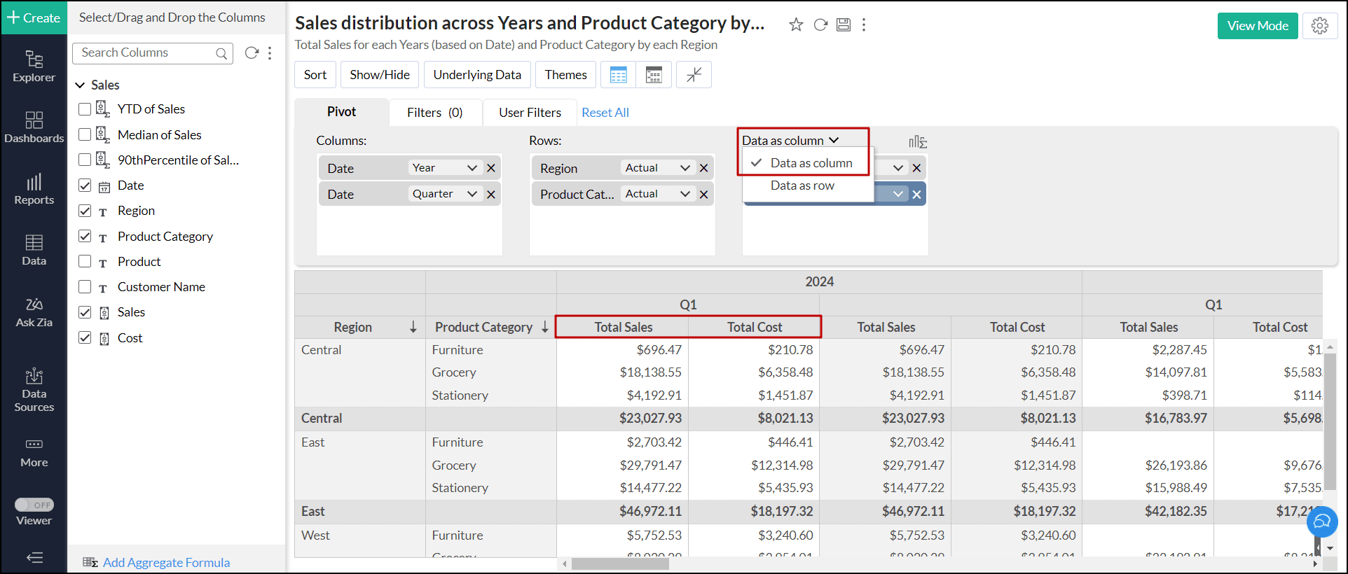 [列としてのデータ]オプションは、データ シェルフに複数のコラムが追加された場合にのみ適用されます。[列としてのデータ]オプションを選択すると、すべての合計コラムがコラム ヘッダー[データ コラム]の下の列に変換されます。ただし、必要に応じてコラム ヘッダーをダブルクリックして名前を変更することができます。下の画像では、総売上高と総コストが列としてのデータ形式で表されています。
