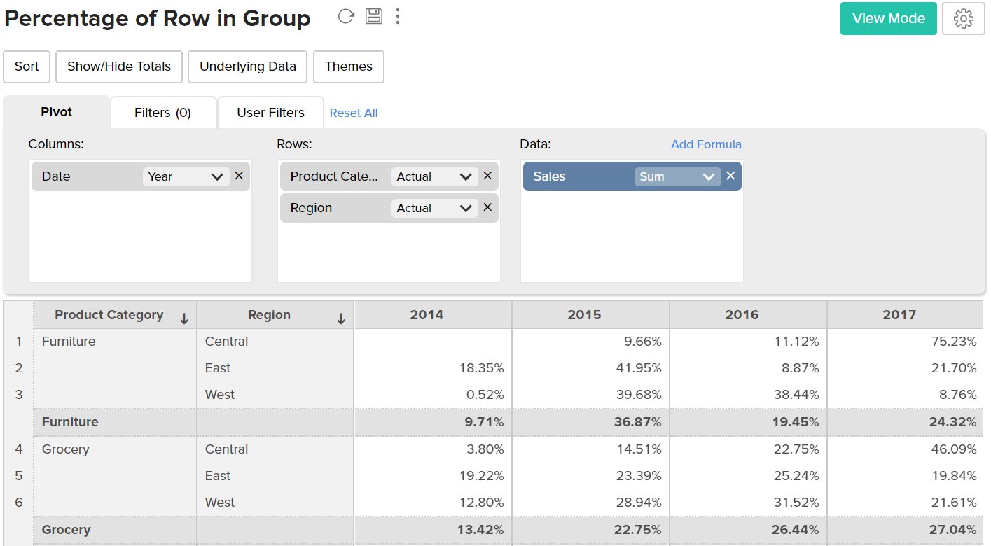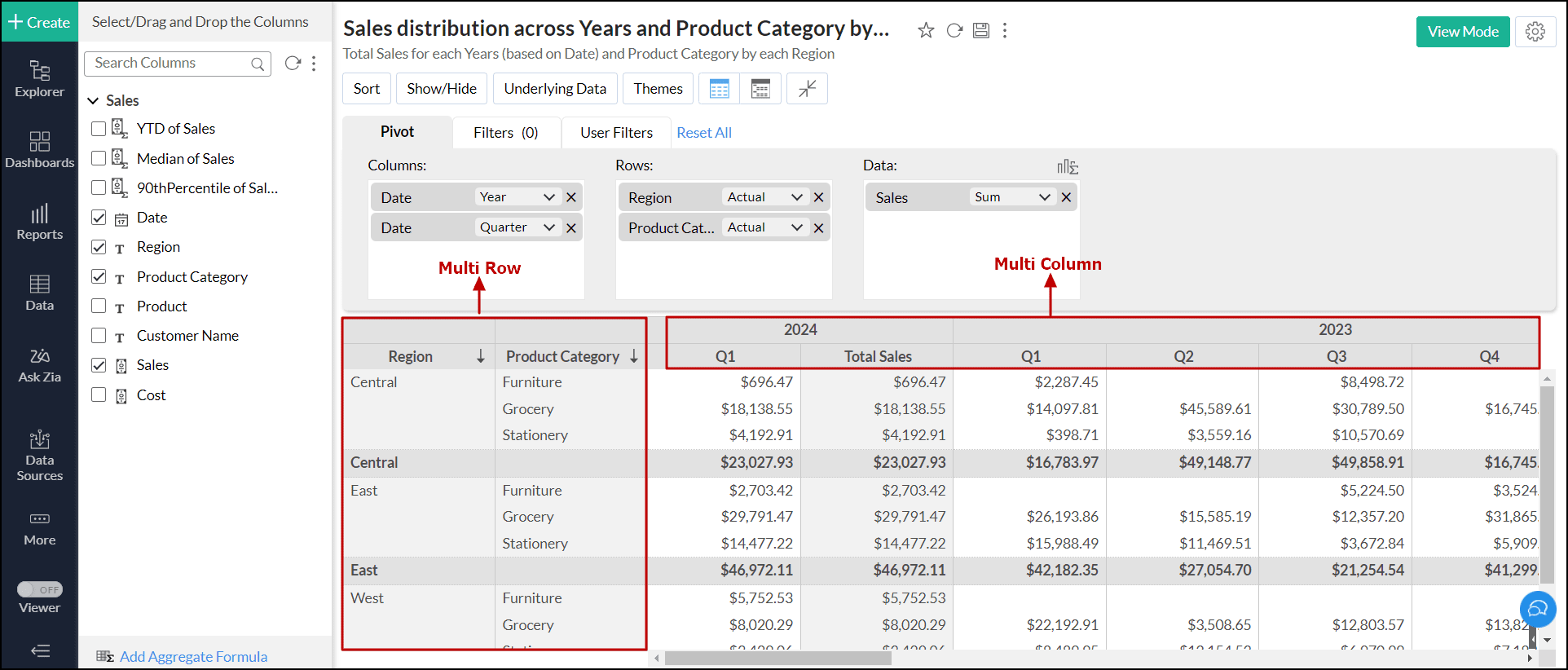 たとえば、列シェルフに地域コラムと製品カテゴリ コラムがある場合、すべての製品カテゴリは地域ごとにグループ化されます。同様に、コラム シェルフに日付を年として、日付を四半期として設定すると、4 つの四半期すべてが各年ごとにグループ化されます。Analytics Plus では、対応する概要情報も提供されます。