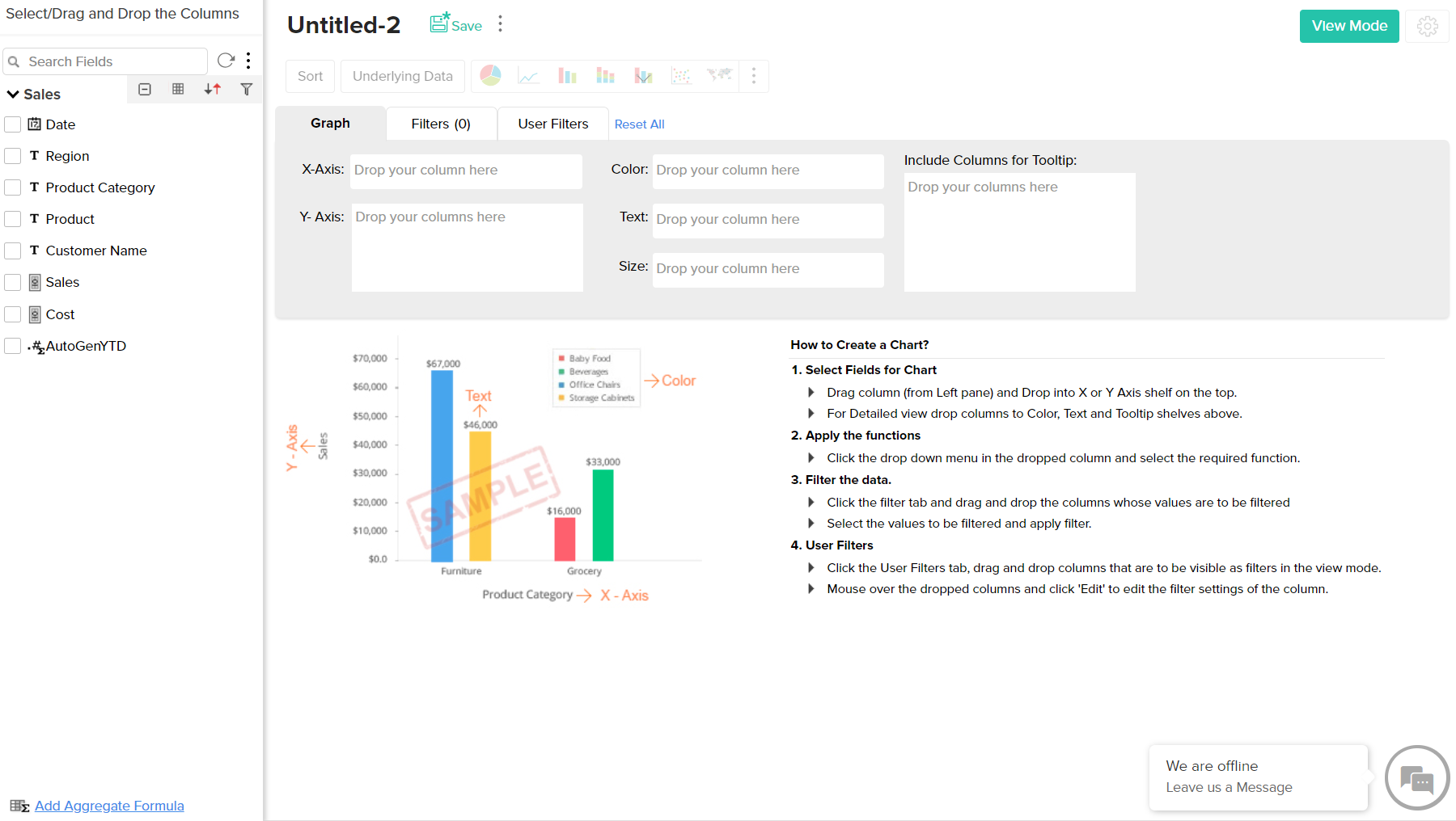 - コラム リスト パネルにリストされている必要なコラムを、ピボット タブのそれぞれのシェルフにドラッグ アンド ドロップします。リストされている各コラムの横にあるチェックボックスを選択して、コラムを適切なシェルフに自動的に配置することもできます。コラムをドロップした後、[ここをクリックしてピボットを生成する]オプションをクリックして、新しいピボット テーブルを作成します。