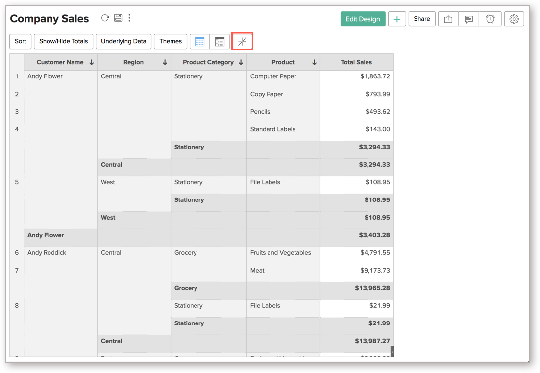 ピボットテーブル内の行、カラム、セルを展開したり折りたたんだりできます。