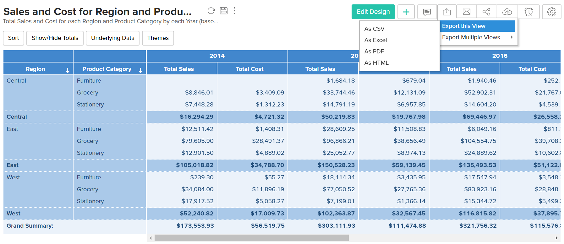 作成したピボットテーブルを CSV、PDF、XLS、HTMLなどのファイル形式でエクスポートできます。
