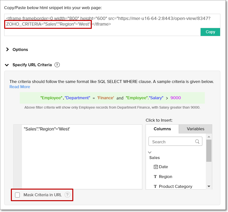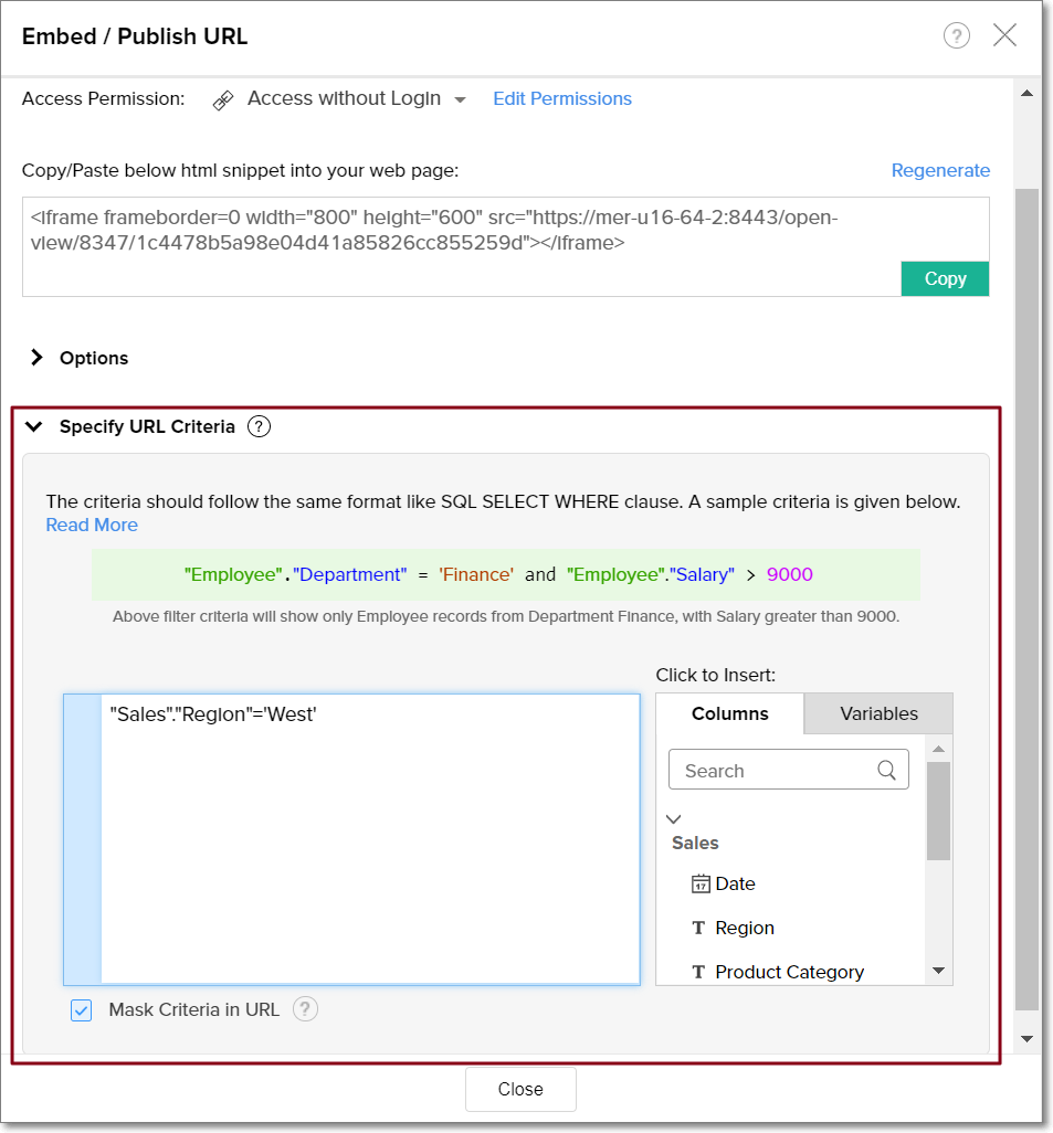 [URL内の条件部分を表示しない] のチェックボックスを選択すると、埋め込みURLから条件のパラメーターは表示されなくなります。