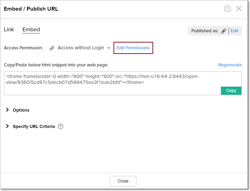 埋め込みレポートの権限を編集する手順は、次のとおりです。