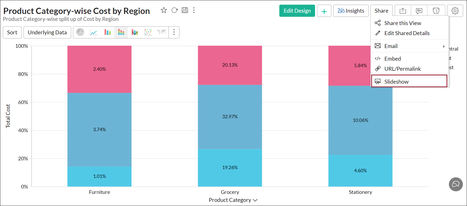 - 必要なレポートを開き、[共有する]→[スライドショー]をクリックします。