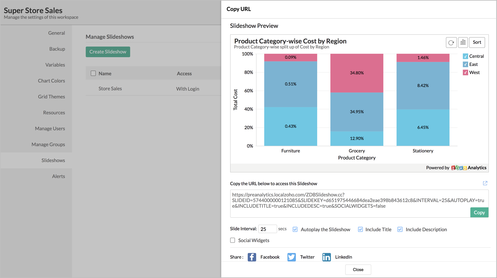 ワークスペース内で任意のレポートを開き、[共有する]→[スライドショー]をクリックします。「スライドショーを管理する」ページが表示されます。
