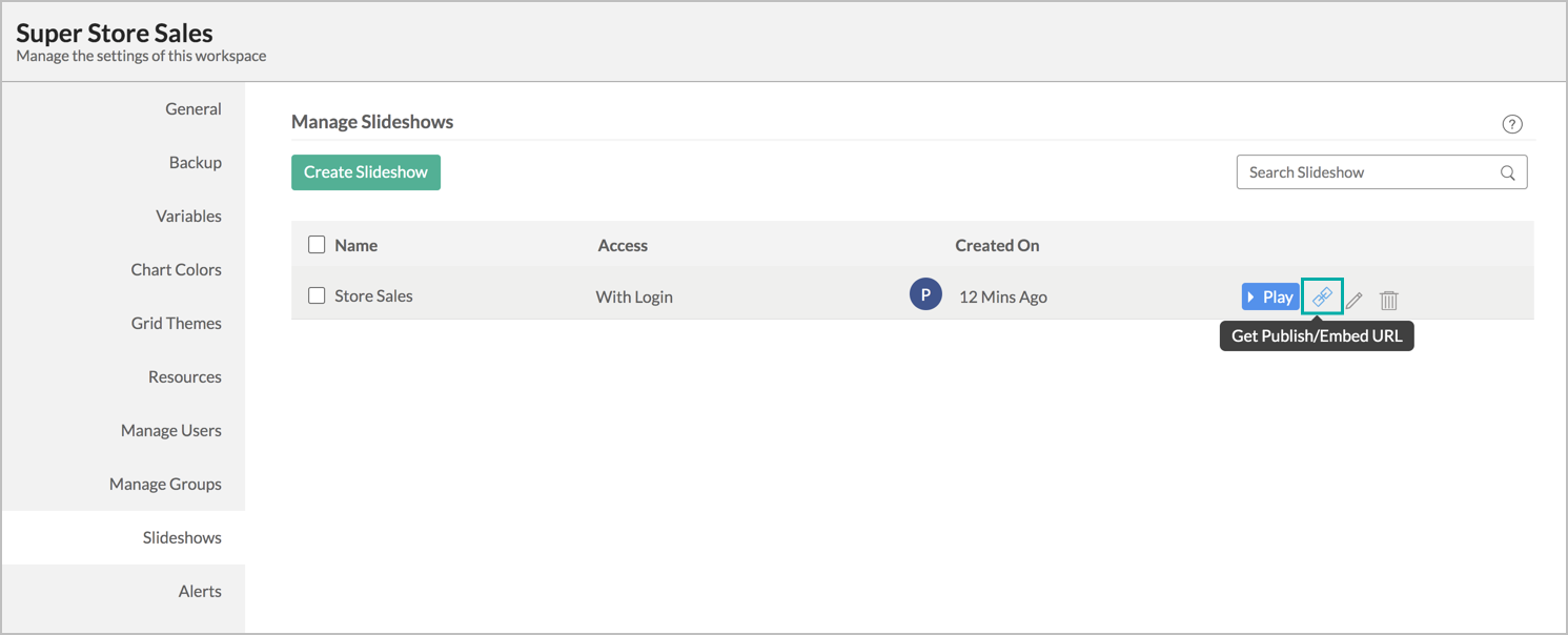 - 「公開/埋め込みURLを取得する」アイコンをクリックして、作成済みのスライドショーのURLをコピーします。
