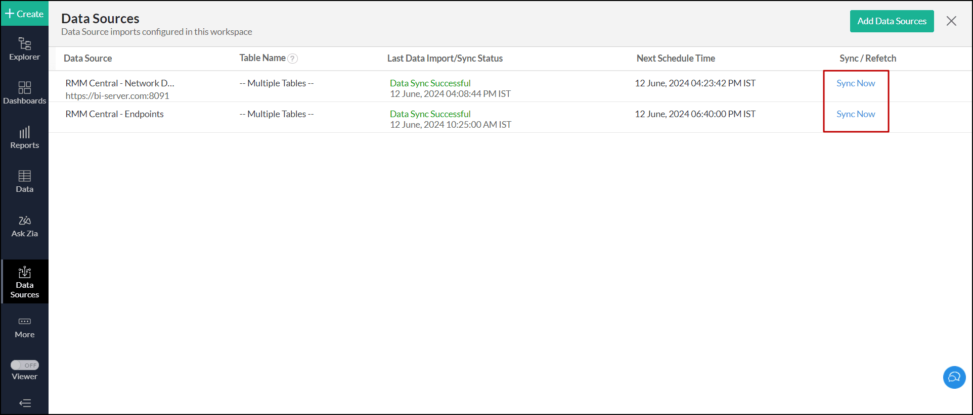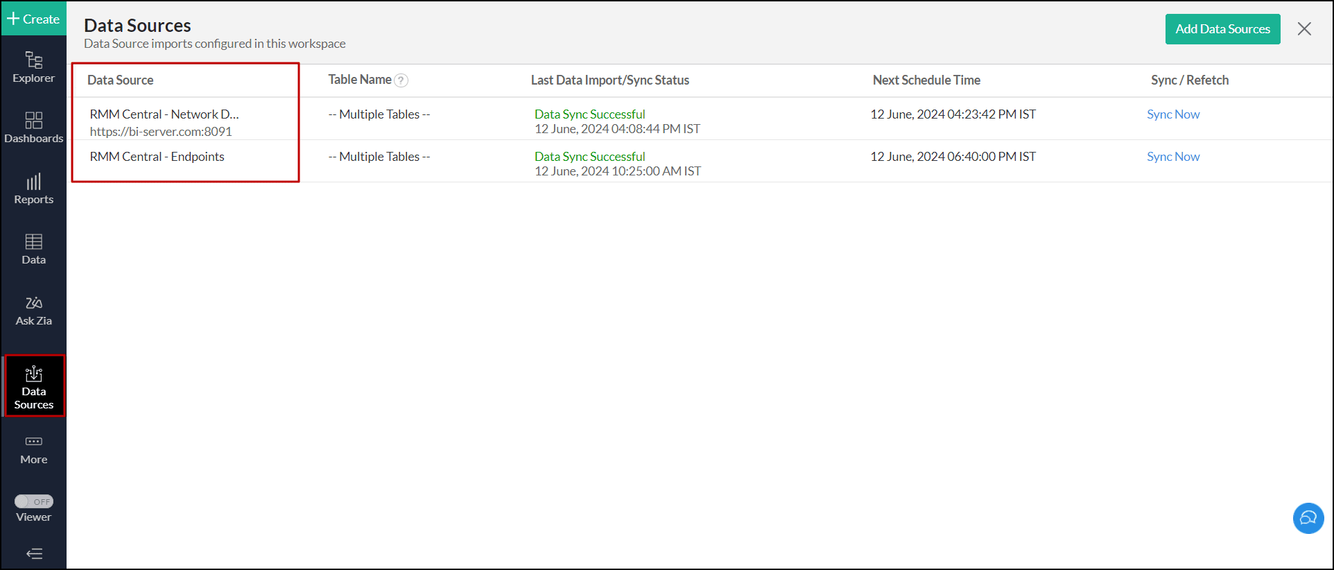 - 必要なワークスペースを開き、サイドパネルから [データソース] オプションをクリックします。