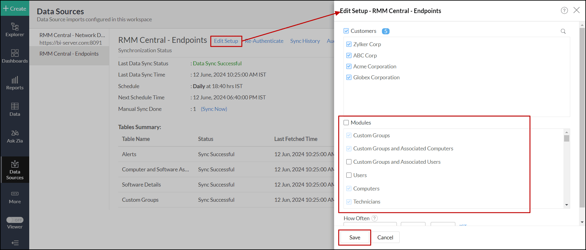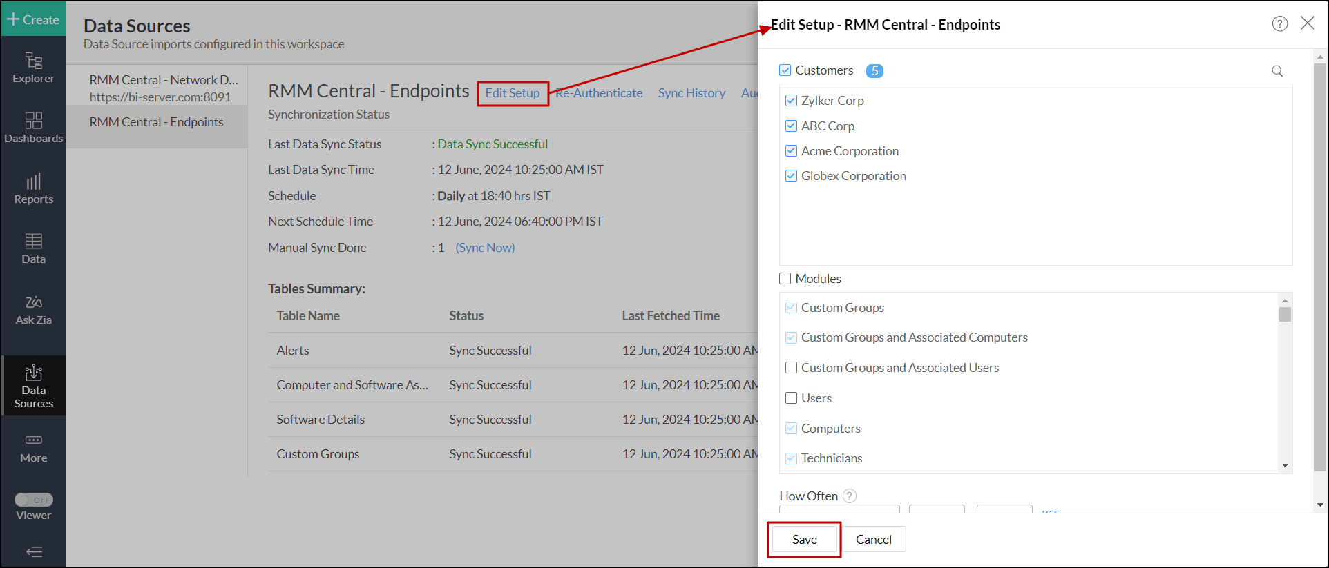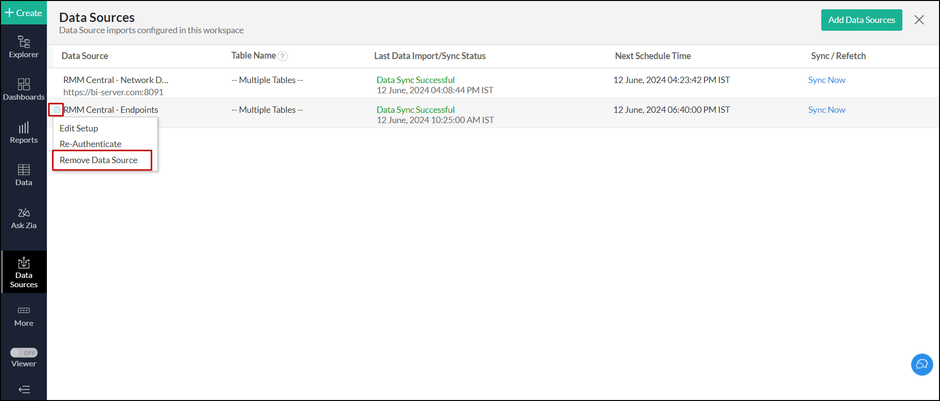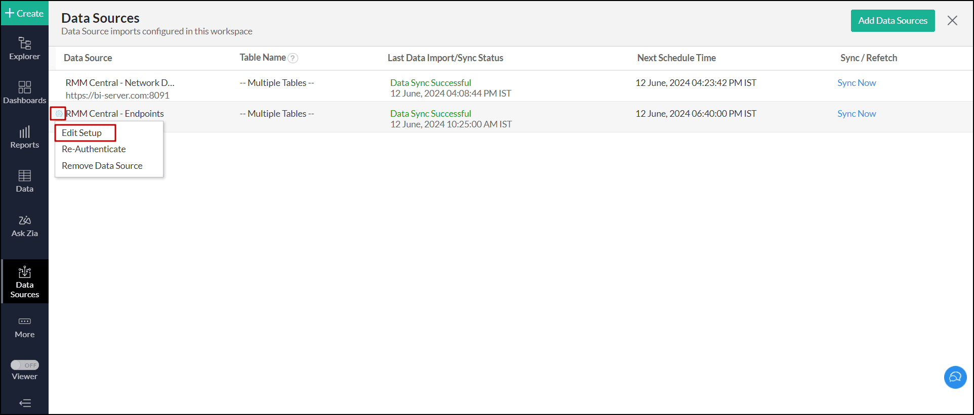 はい。これを行うには、サイドパネルの[データソース]オプションをクリックします。表示されるページで、RMM Central‐エンドポイントまたはRMM Centralーネットワークデバイスデータソースに移動し、 [セットアップを編集]ボタンを選択します。