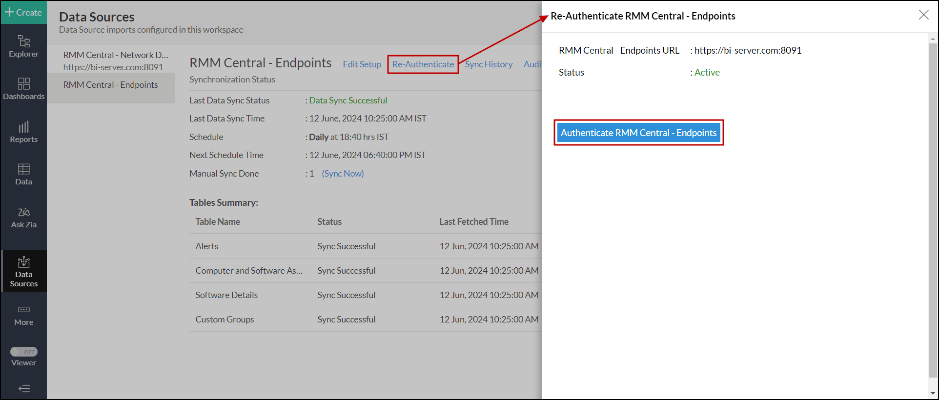 [データソース]サマリページから[再認証]リンクにアクセスすることもできます。RMM Centralデータソースにカーソルを当てて表示される[設定]アイコンをクリックし、 [セットアップを編集]オプションを選択します。表示されるポップアップで、[RMM Centralを認証].をクリックします。APIキーを入力し、[RMM Centralを認証]をクリックします。