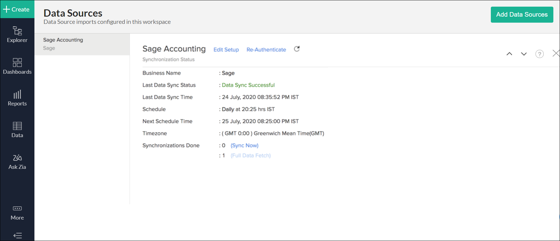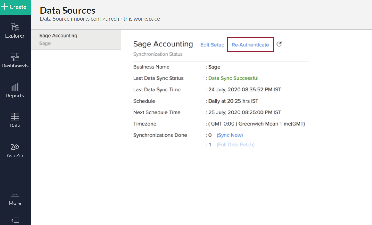 Sage Accountingデータのインポートまたは同期プロセスはさまざまな理由により失敗するときがあります。この問題を解消するには、サイドパネルから[データソース]オプションをクリックして、[再認証]リンクをクリックします。表示されるポップアップで、[Sage Accountingを認証].をクリックします。Sage Accountingアプリ名とシークレットトークンを入力し、[Sage Accountingを認証]ボタンをクリックします。