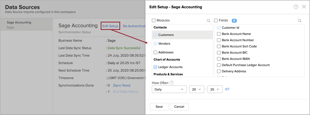 - スケジュール:Analytics PlusとSage Accountingとの間のデータ同期頻度。
