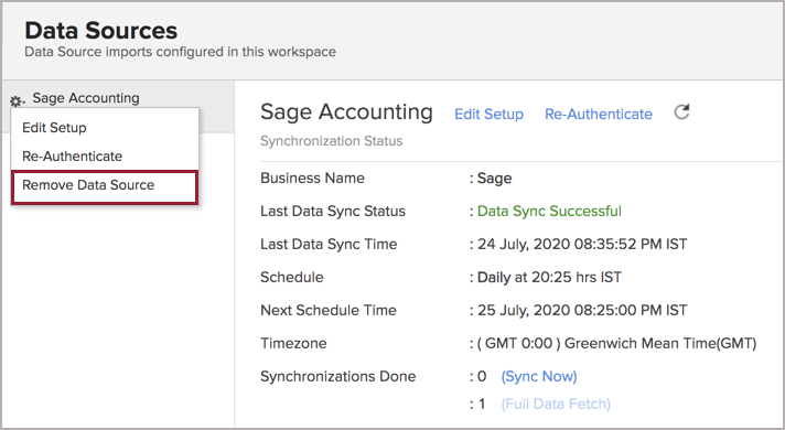 接続と同期設定を編集するには、サイドパネルの[データソース] -> [Sage Accounting]の順に選択します。