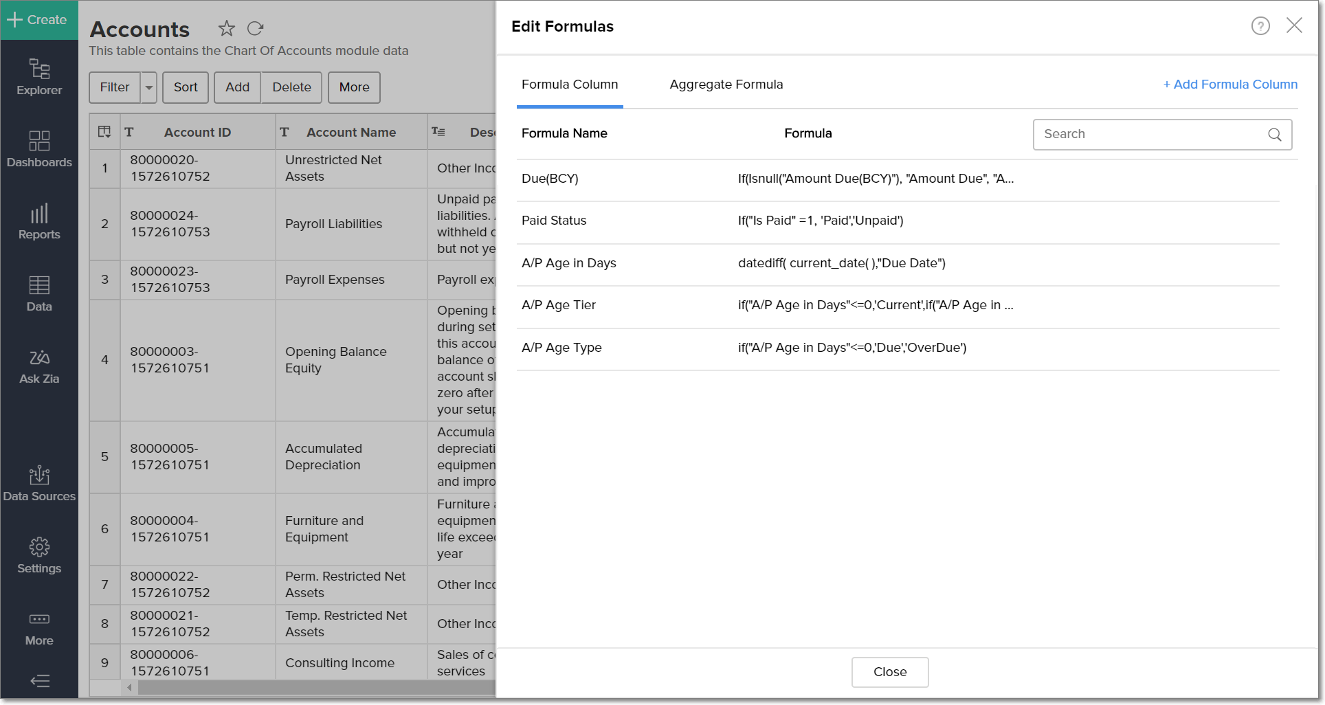 数式は、必要なレポートを作成するAnalytics Plus強力な数式エンジンを使って定義できる計算です。詳細は、このドキュメントを参照してください。Sage Accountingモジュールに基づいて作成されたデフォルト数式もいくつかあります。デフォルト数式を表示するには、必要なテーブルを開き、[追加]をクリックして、[数式を編集]オプションを選択します。