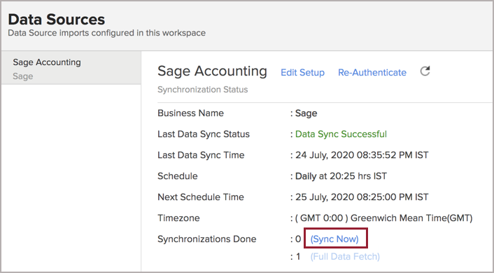はい。このためには、サイドパネルから[データソース] -> [Sage Accounting]の順に選択します。表示されるデータソースページで、[今すぐ同期]をクリックします。