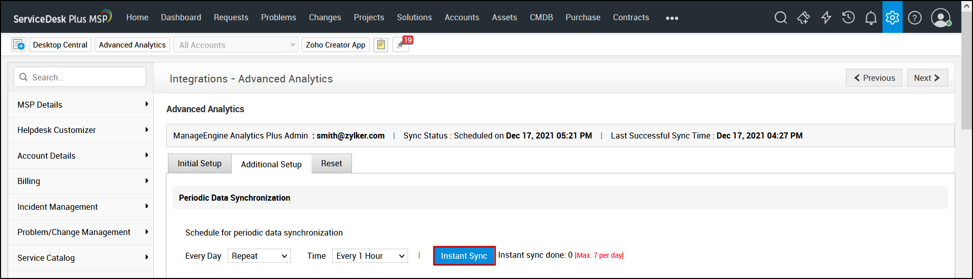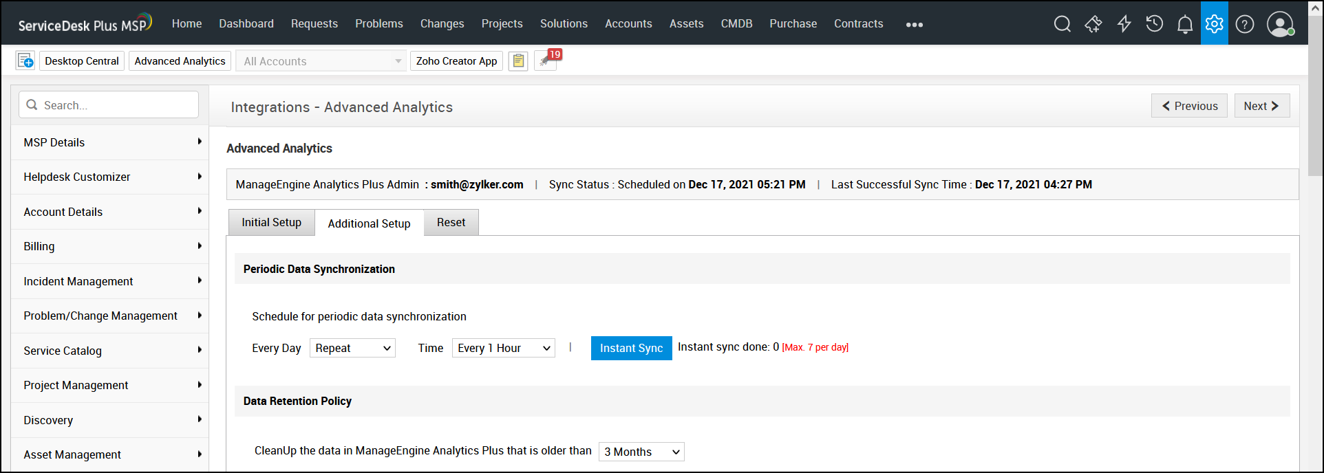 Analytics PlusとServiceDesk Plus MSP統合を設定するには、ユーザーはServiceDesk Plus MSPの管理者、およびAnalytics Plusのアカウント管理者または組織管理者である必要があります。