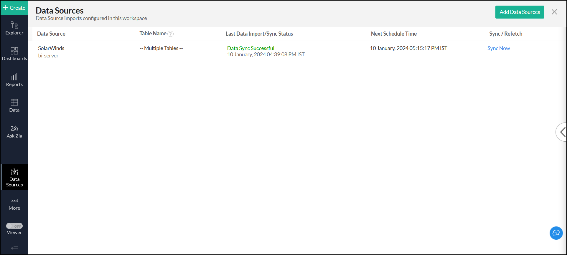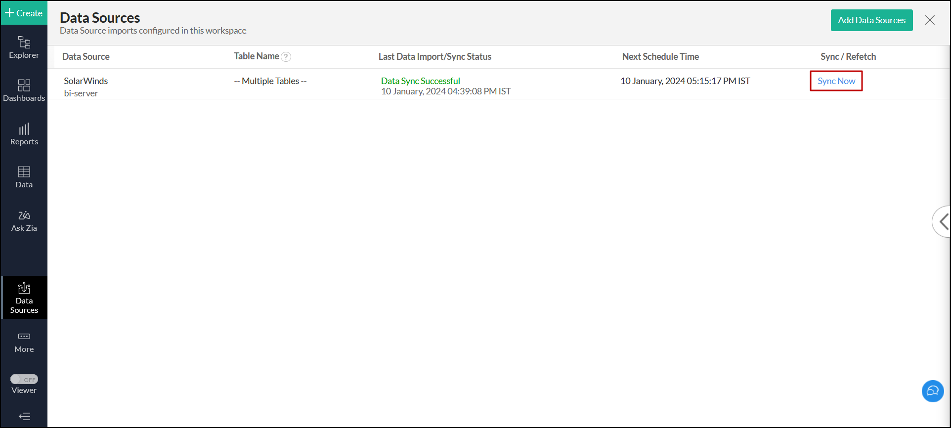 はい。これを行うには、サイドパネルから [データソース] オプションをクリックしてこのページにアクセスします。表示されるページで、SolarWindsソースに移動し、対応する[今すぐ同期]ボタンをクリックします。