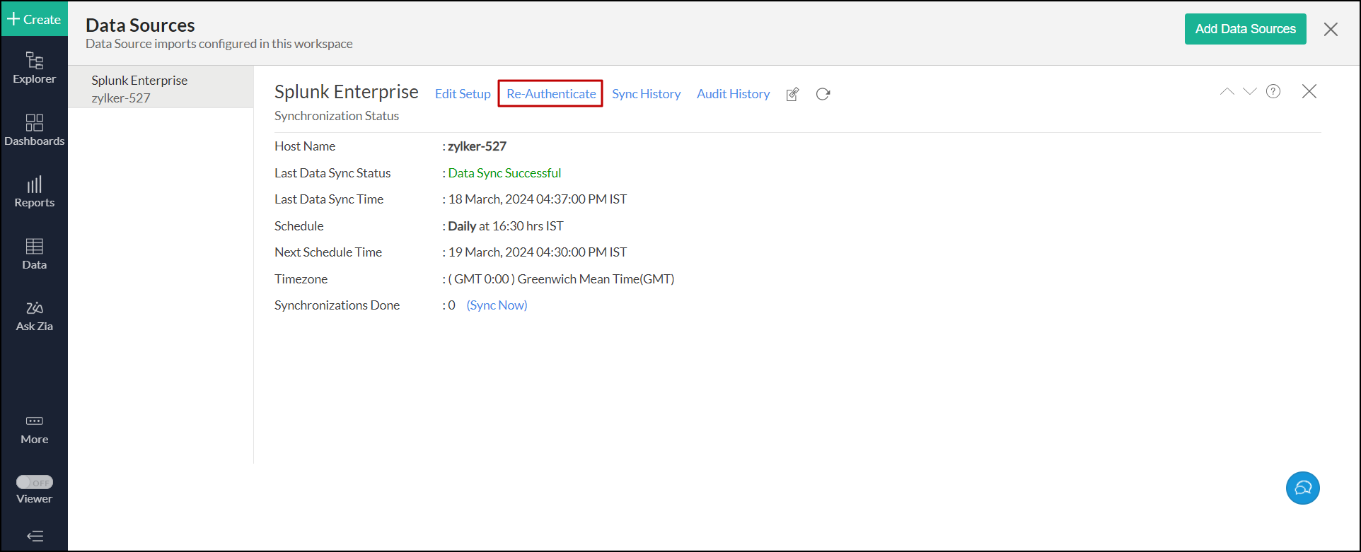 - Splunk Enterpriseデータソースに移動し、[再認証]リンクをクリックします。