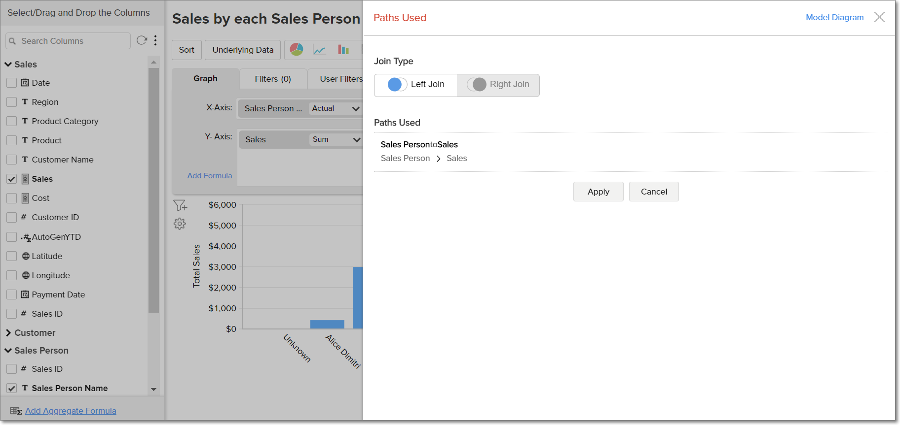 左結合 - レポートは、子テーブル(左)のすべての行と、親テーブル(右)の一致する行のみで計算されます。一致処理は、子と親テーブルの間で定義したルックアップ列に基づいて行われます。これがデフォルトの結合タイプです。この場合、売上テーブルは子、販売担当者テーブルは親になります。