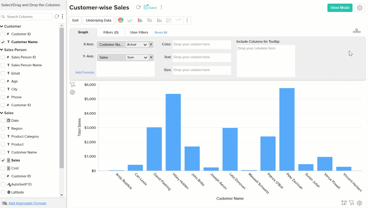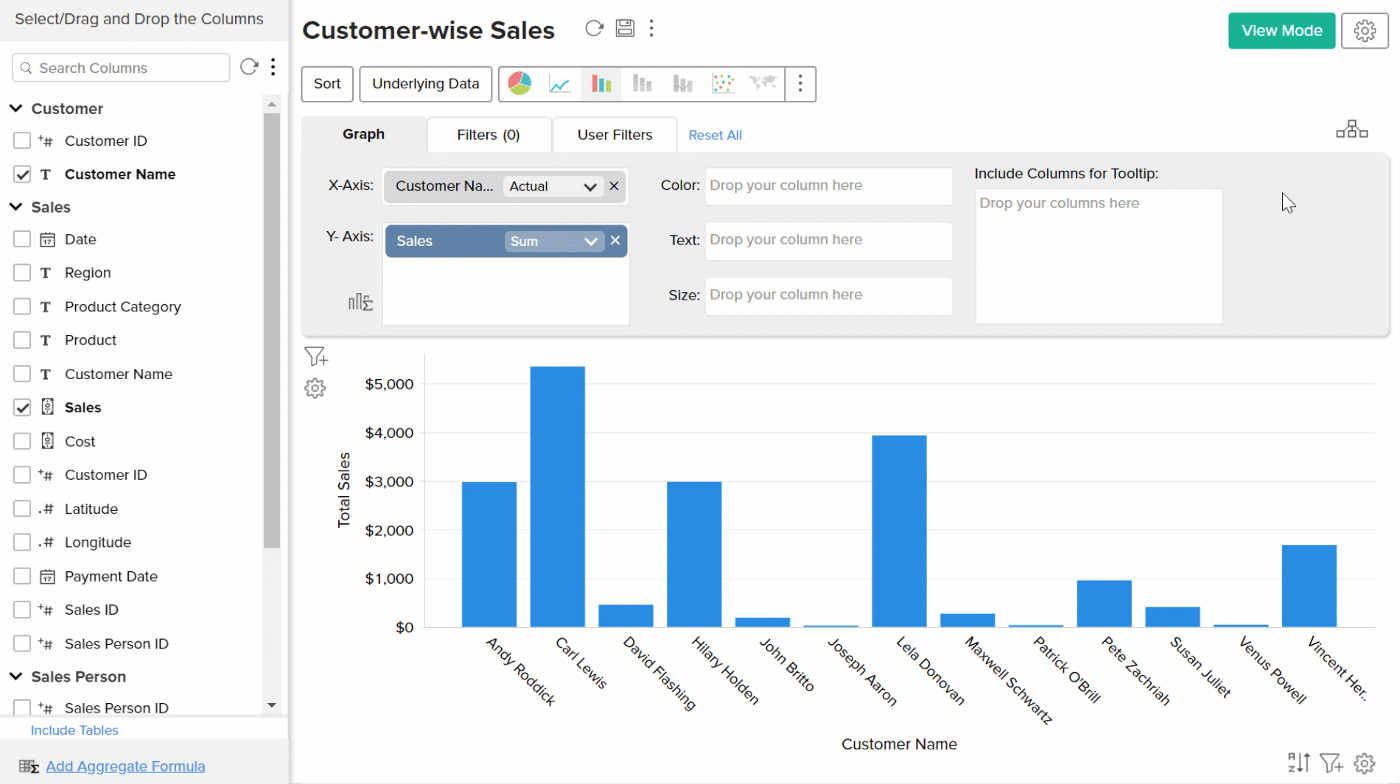 また、関連するテーブルからの列を使って、レポートをフィルタリングすることもできます。上記の例製品名列を製品詳細テーブルからの引継義を使って、チャートデータをフィルタリングし、下記のとおり、選択した製品の販売担当者別の売上を表示することができます。
