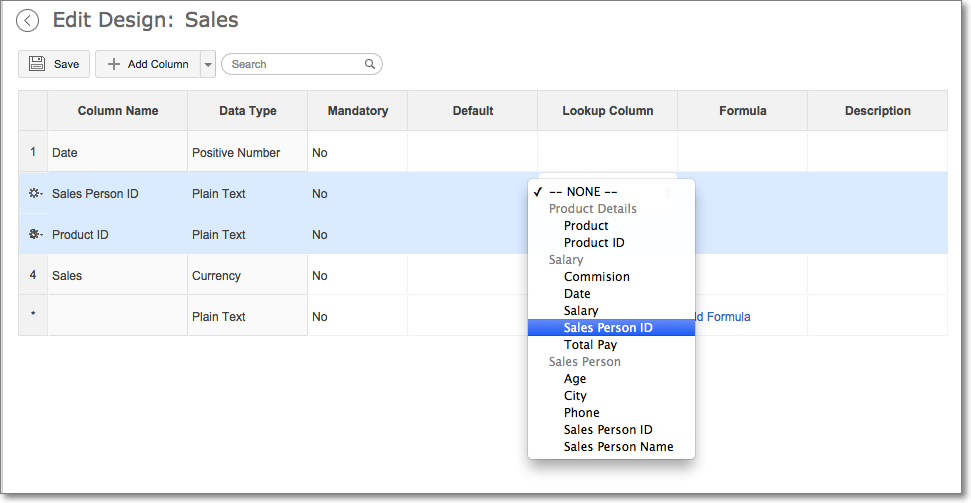 表示されるダイアログボックスで、Data Type販売担当者IDのデータタイプ列にあるセルをクリックし、ドロップダウンリストからルックアップ列をデータタイプとして選択します。