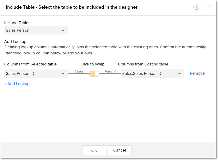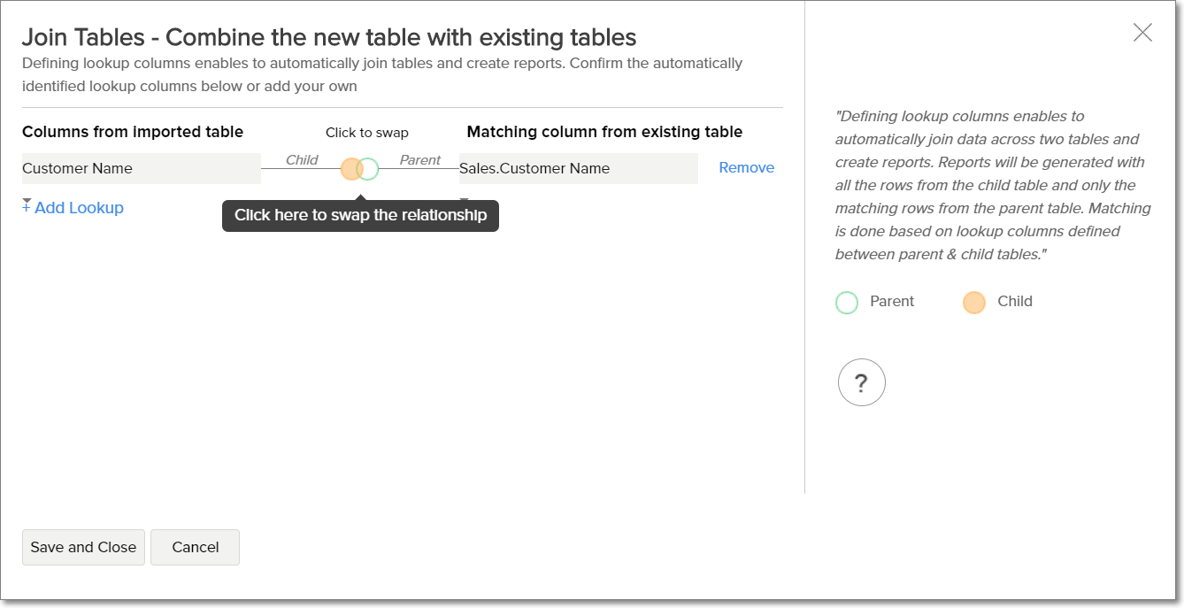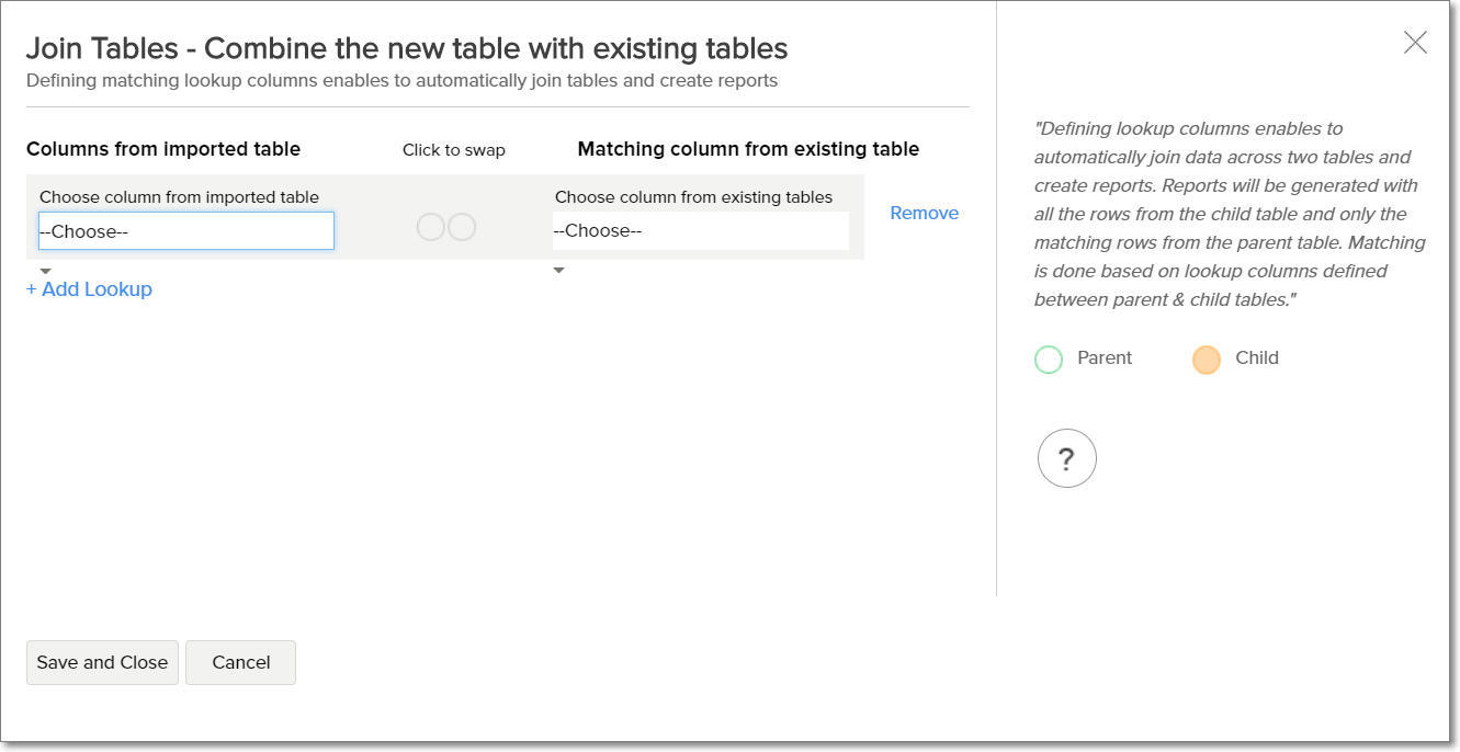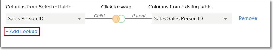 - デフォルトでは、既存のテーブルの列は親として定義され、新しいテーブルの列は子として定義されます。この関係性は交換でき、ルックアップ提案を削除することもできます。インポートウィザードから自動結合セクションを参照してください。[+ルックアップを追加]リンクをクリックして、複数のルくアップを削除することもできます。