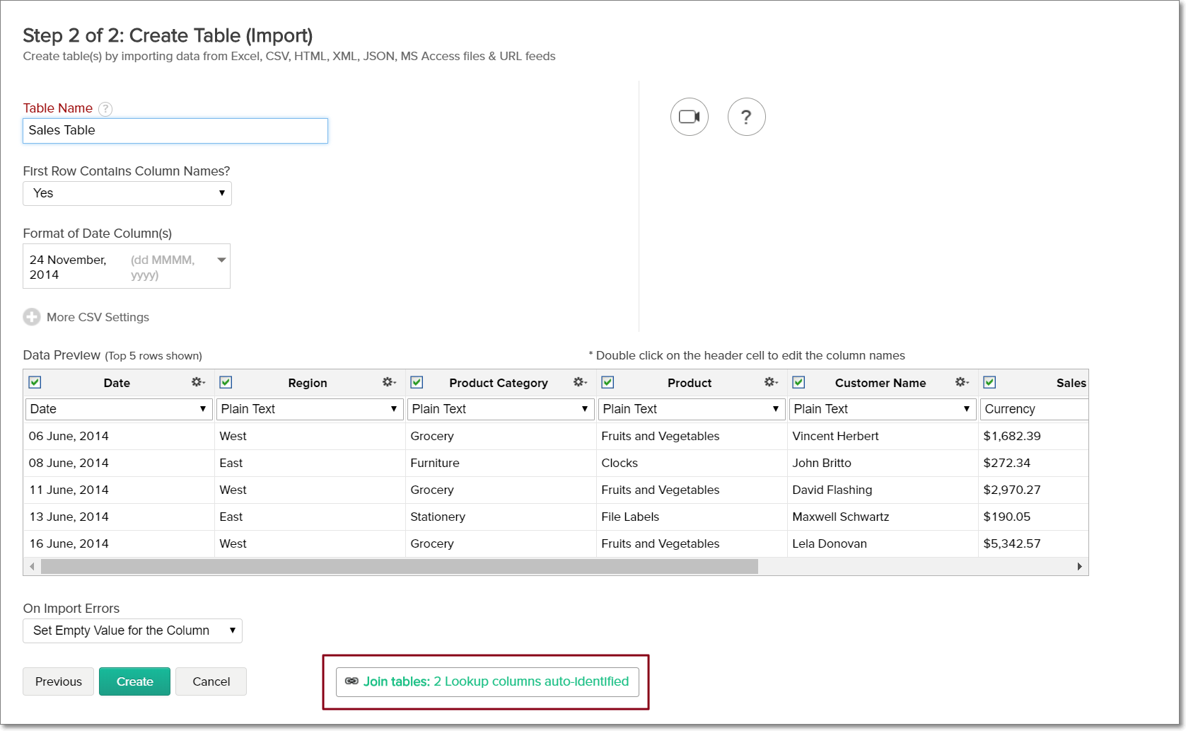 - Analytics Plusはインポート中の新しいデータを既存のテーブルと一致照合して、名前とデータタイプが同じ列を識別し、結合を提案します。 下部[テーブルを結合:ルックアップ列が自動識別されました]リンクをクリック(手順2/ 2:テーブルを作成)して、ルックアップを作成できます。