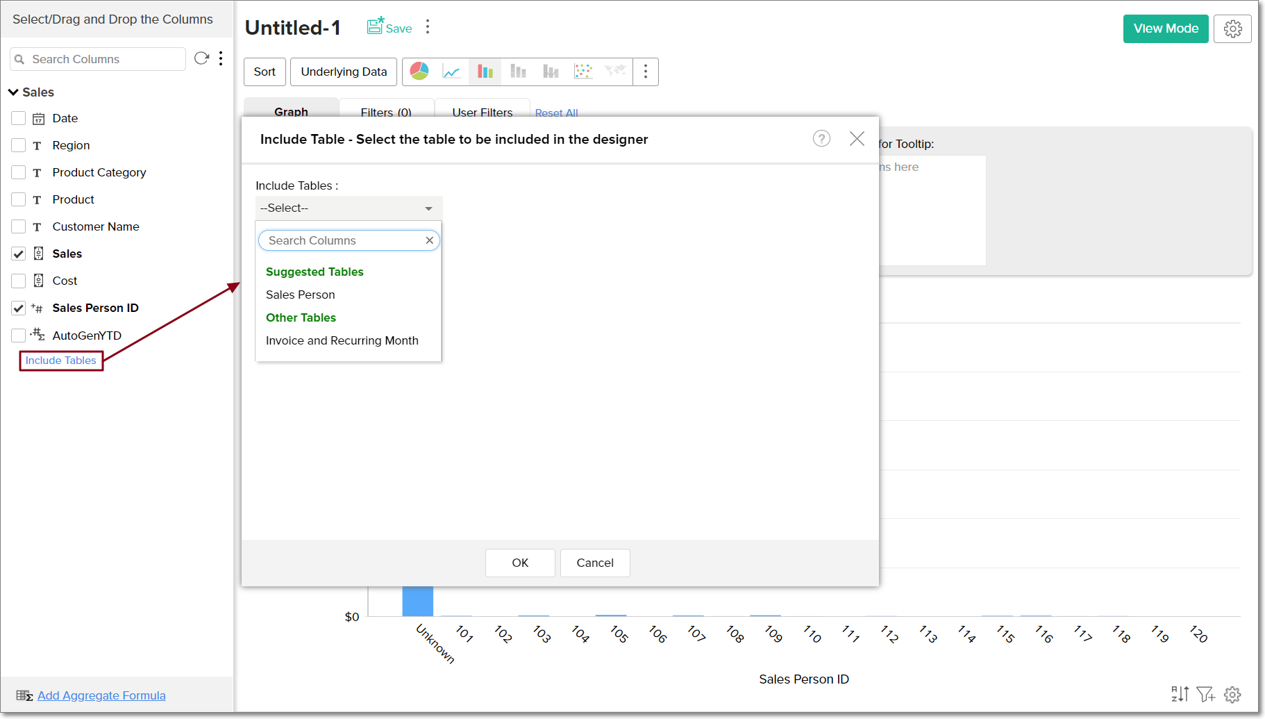テーブルがルックアップ列を使って互いに関連されたら、ルックアップ関係性のあるテーブルを選択して、レポートを作成できます。ManageEngine Analytics Plusは、これらのテーブルからのデータを自動結合し、テーブル全体から列をドラッグ・アンド・ドロップしたときレポートを生成します。