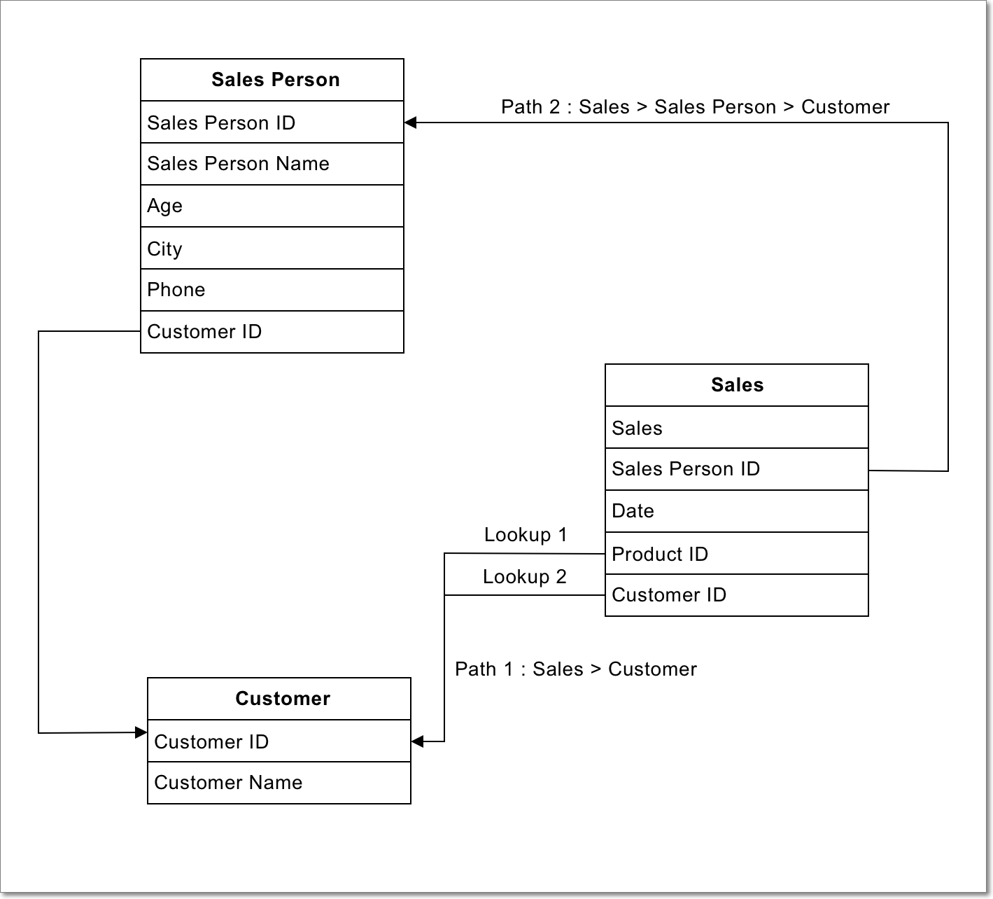 売上モデルの例をみてみましょう。ここでは、売上と顧客テーブルを2つのルックアップ列を使って、すなわち、製品ID と顧客IDを使って直接結合します。 売上テーブルには、販売担当者テーブルへのルックアップもありますが、ここでは販売担当者IDを使います。販売担当者と顧客テーブルは顧客IDを使って結合します。これで、売上と顧客テーブルの間の間接的な接続が販売担当者テーブルでから作成されます。