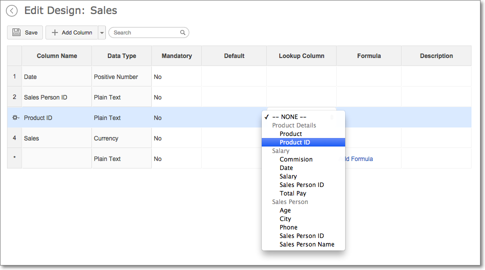 これらの関連列により、売上と販売担当者テーブルの間のルックアップ関係性を販売担当者Id列から定義dけいます。同様に、売上と製品詳細テーブルの間で、共通のProduct_IDをもとにルックアップ関係性を確立できます。ルックアップ列関係性が定義されると、ManageEngine Analytics Plusは、これらのテーブルに基づいてレポート作成を開始したとき自動結合を使って、これらのテーブルからデータを自動結合します。
