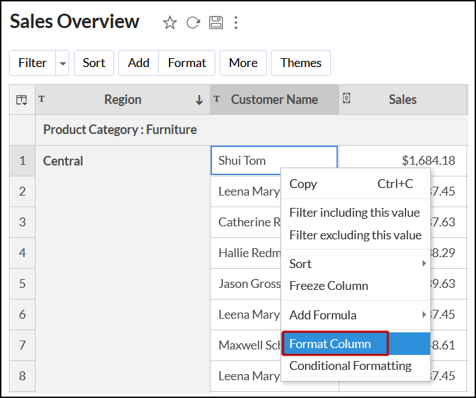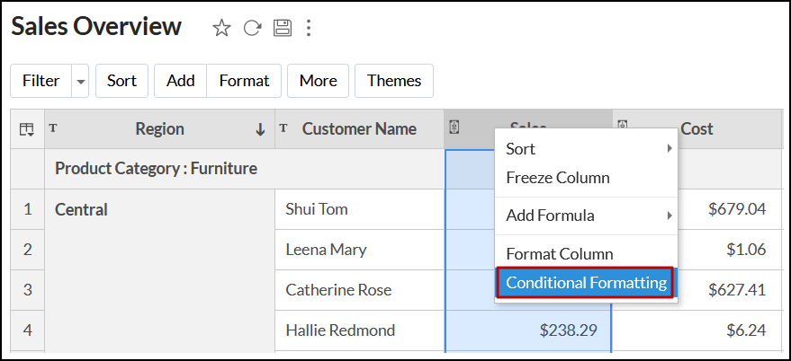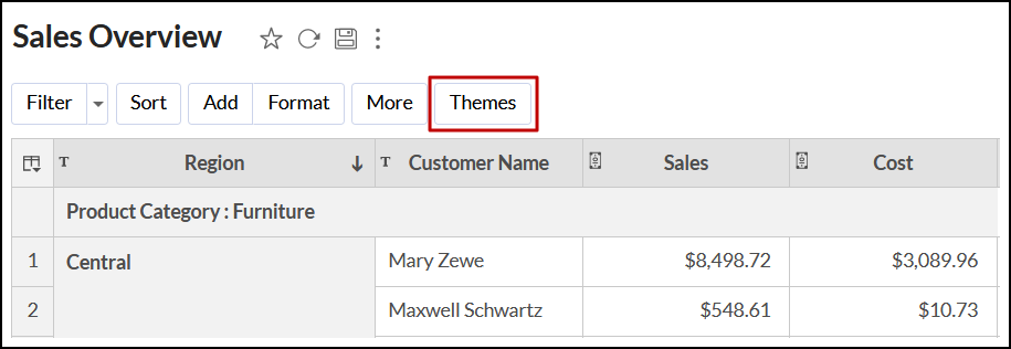 - 対象の表形式レポートを表示モードで表示し、ツールバーの[テーマ]をクリックします。