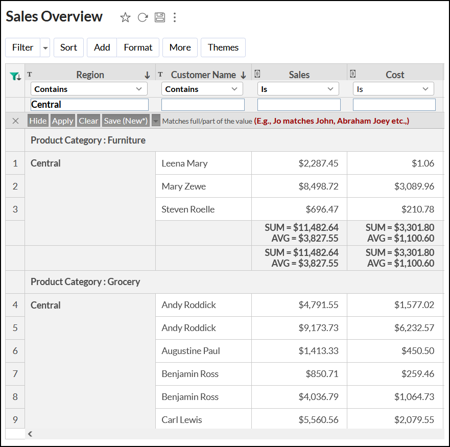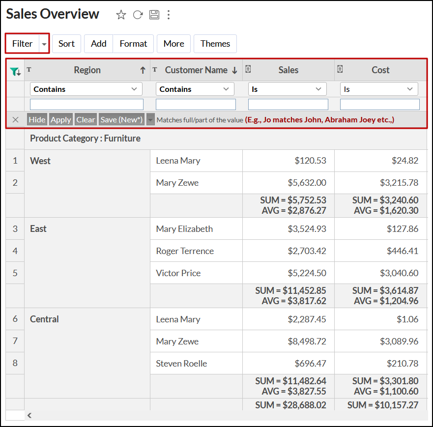表形式レポートを動的にフィルタリングして必要なデータを表示できます。