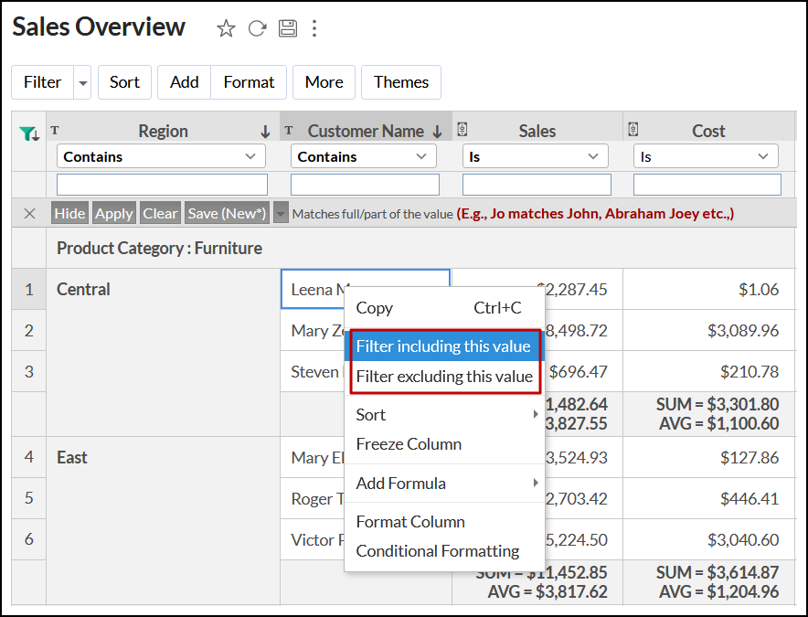 Analytics Plus Cloudでは、表形式レポートに特定の値を含めたり除外することができます。