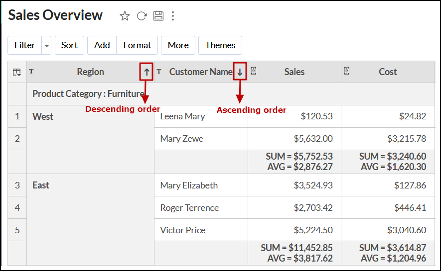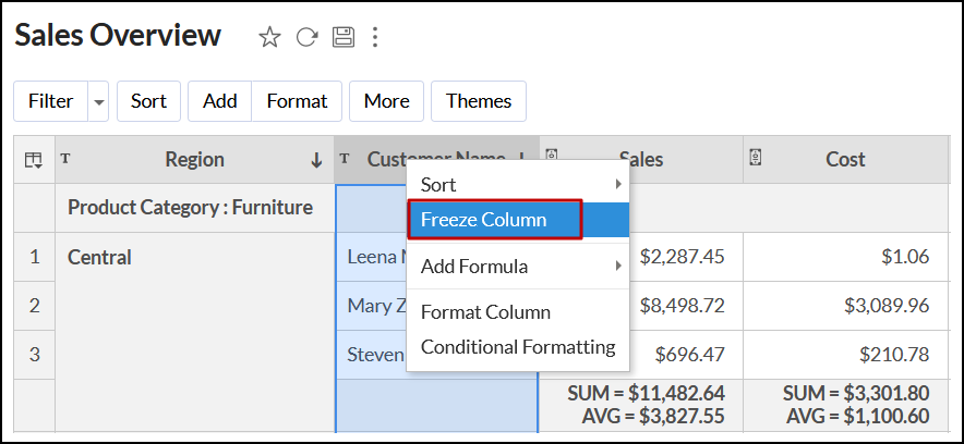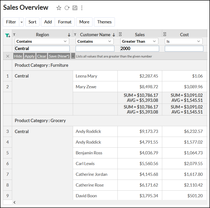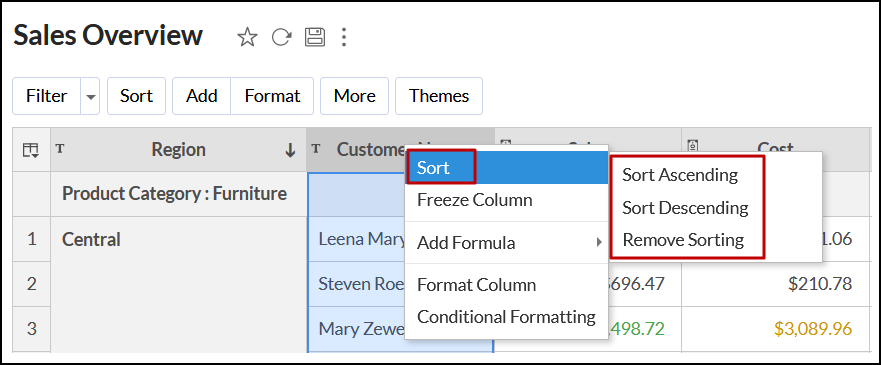 表形式レポートにはカラムの並べ替え、フィルタリング、書式設定などのオプションが用意されています。
