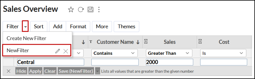 - 対象の表形式レポートを表示し、ツールバーの[フィルター]ボタンをクリックします。