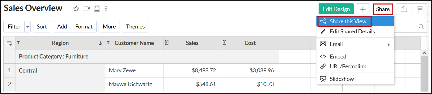 権限とフィルターを適用し、表形式レポートをユーザーと共有します。