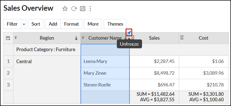 カラムの固定を解除するには、カラムヘッダーの右上隅にある[固定の解除]アイコンをクリックします。