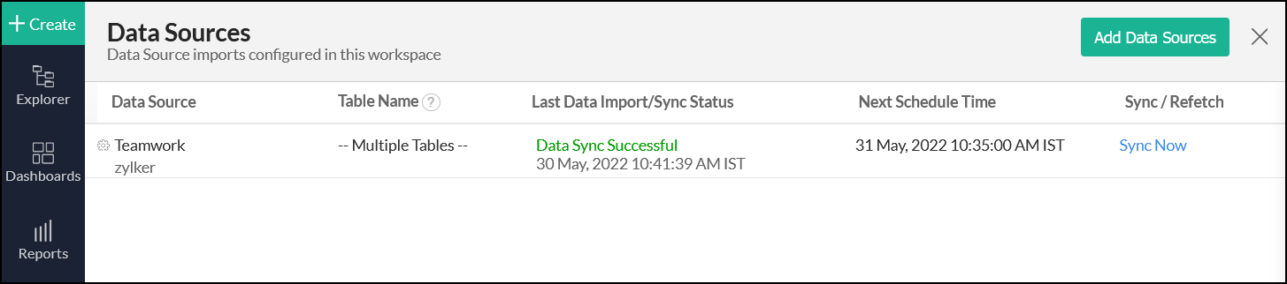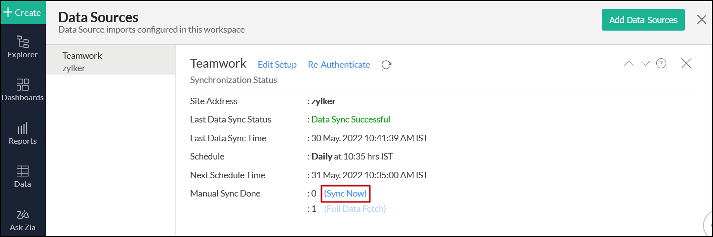 Teamwork Projectsデータソースページにアクセスして[今すぐ同期]をクリックすることもできます。