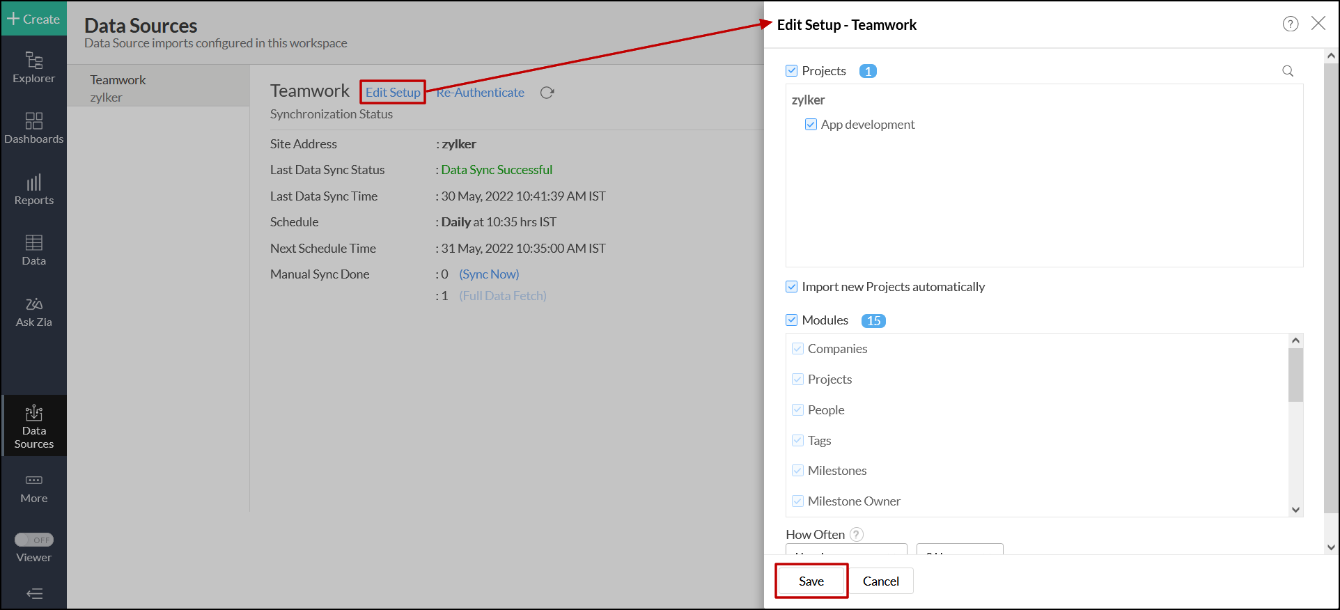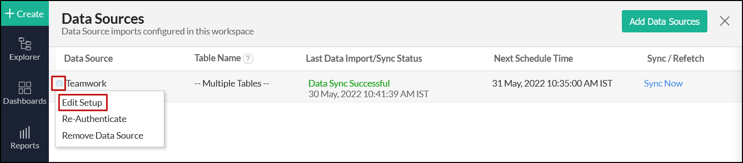Teamworkデータソースに移動し、[セットアップを編集]リンクをクリックします。