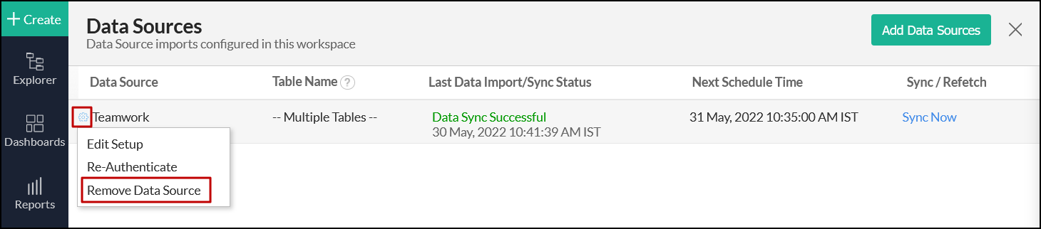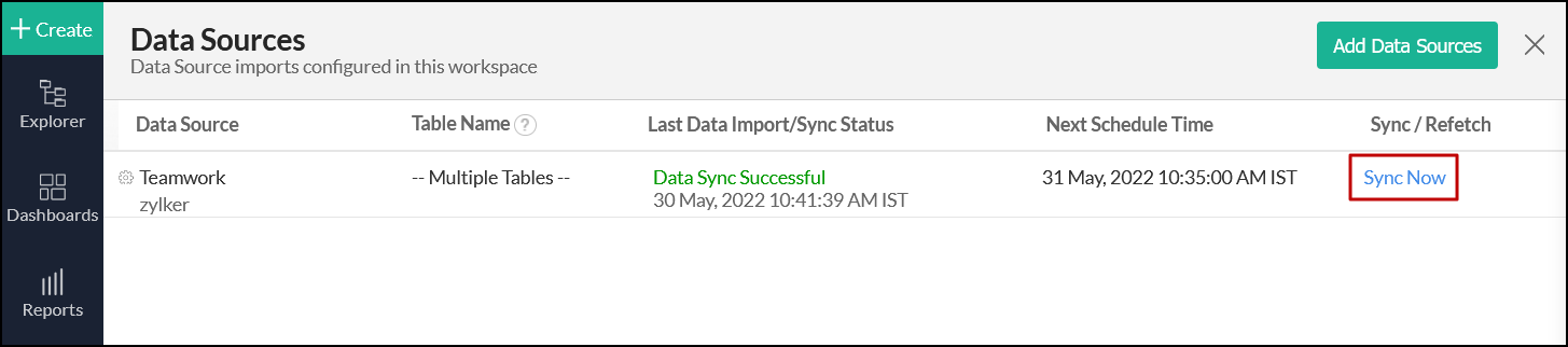はい。これを行うには、サイドパネルの[データソース]オプションをクリックします。表示されるページで、Teamwork Projectsソースに移動し、対応する[今すぐ同期]ボタンをクリックします。