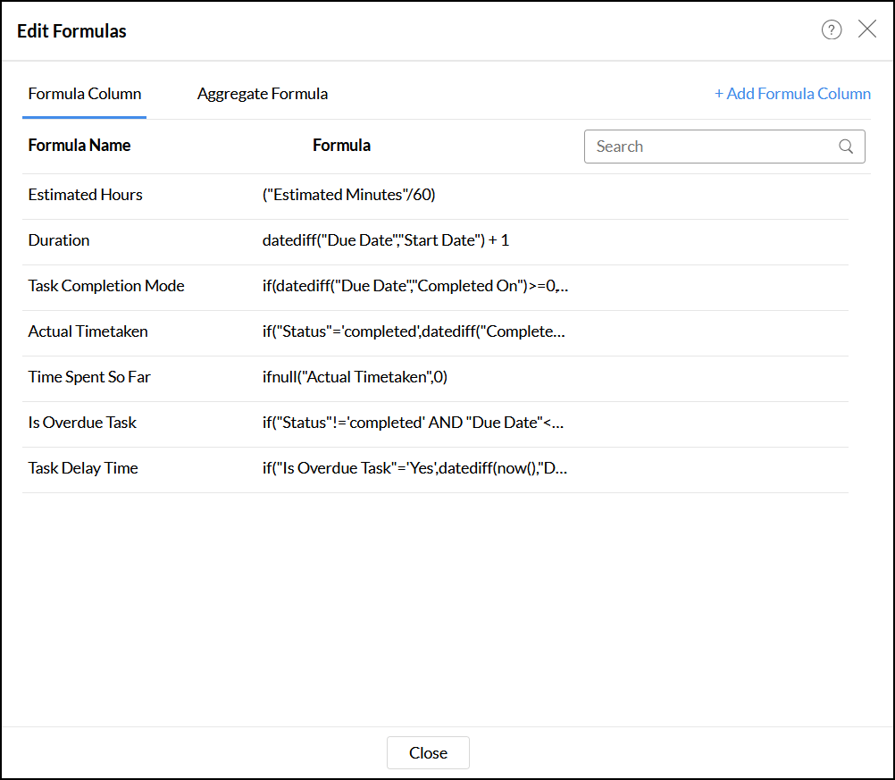 数式は、必要なレポートを作成する強力な数式エンジンを使って定義できる計算です。詳細は、このドキュメントを参照してください。Teamwork Projectsモジュールに基づいて作成されたデフォルト数式もいくつかあります。デフォルト数式を表示するには、必要なテーブルを開き、[追加]をクリックして、[数式を編集]オプションを選択します。